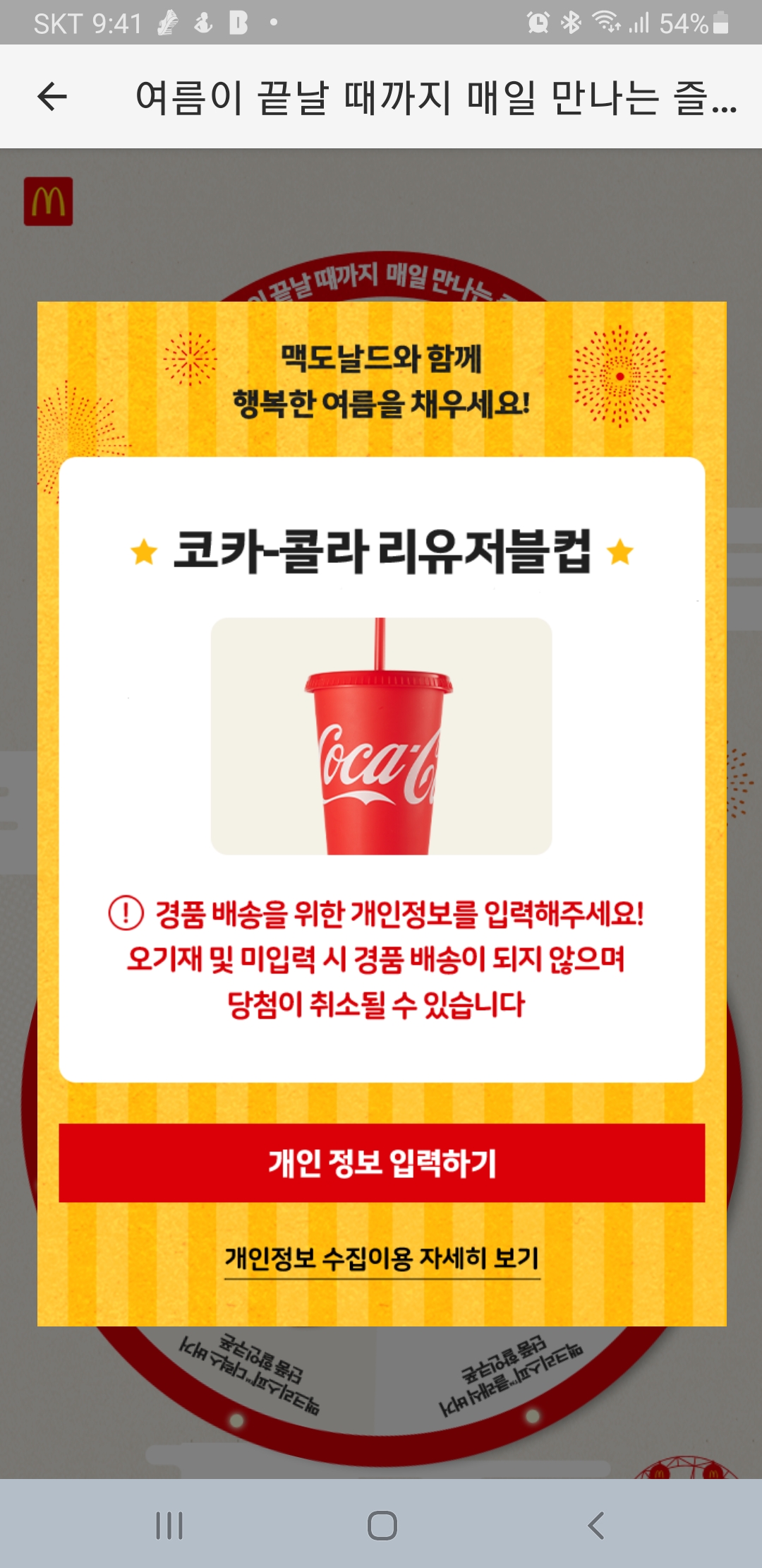 저번에 맥도날드 어플에서 진행된 행운의 원더랜드 이벤트에서 매일매일 룰렛을 돌리다 당첨된 코카-콜라 리유저블 컵이 오늘 도착했습니다. 탄산음료 할인쿠폰만 보다가 막바지에 운 좋게 당첨됐네요.