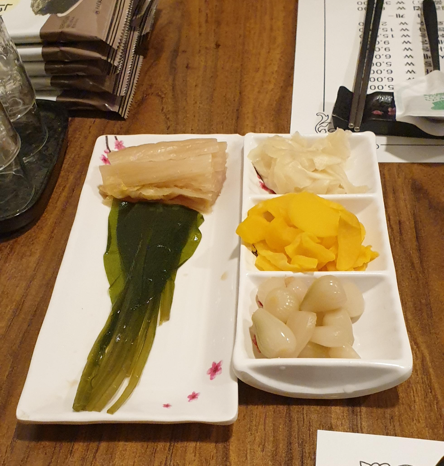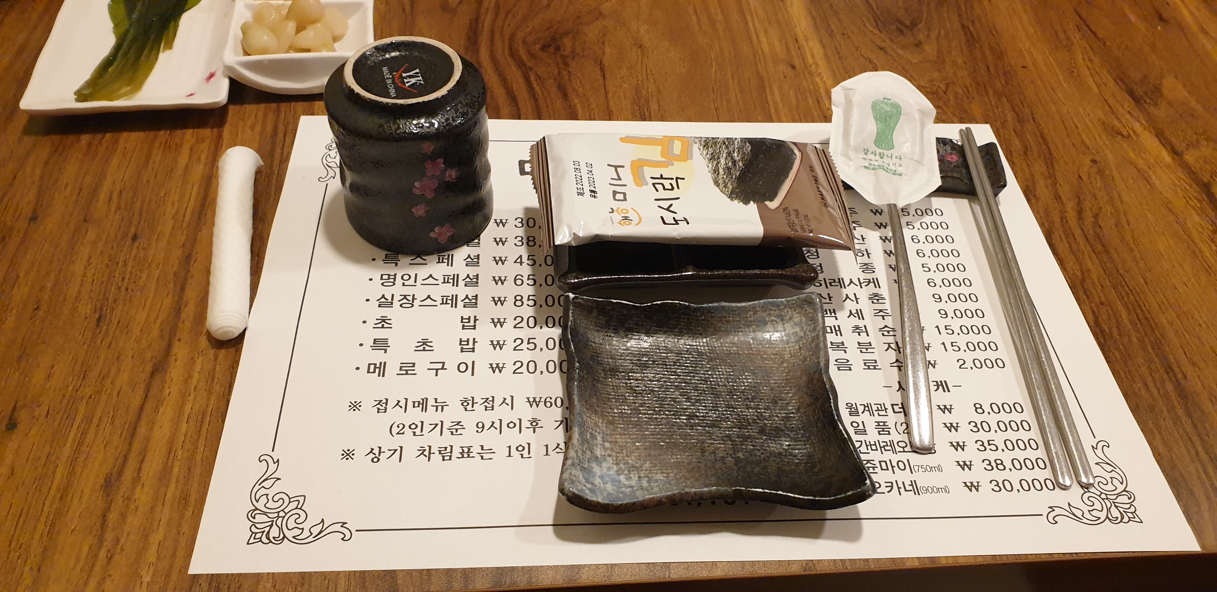 그리고 김과 소금장, 간장, 앞접시, 백김치 단무지 락교 등등도 미리 준비되어있었습니다.