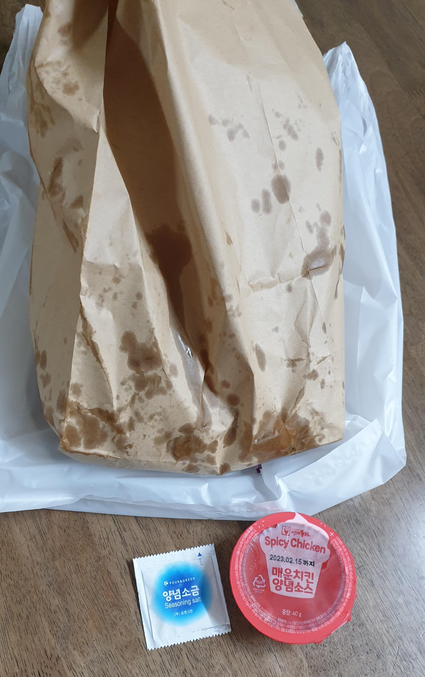 포장은 종이봉투에 담고 다시 비닐에 담아 주십니다. 기본적으로 소금은 주시는데 무나 소스나 콜라는 구매를 해야 합니다.