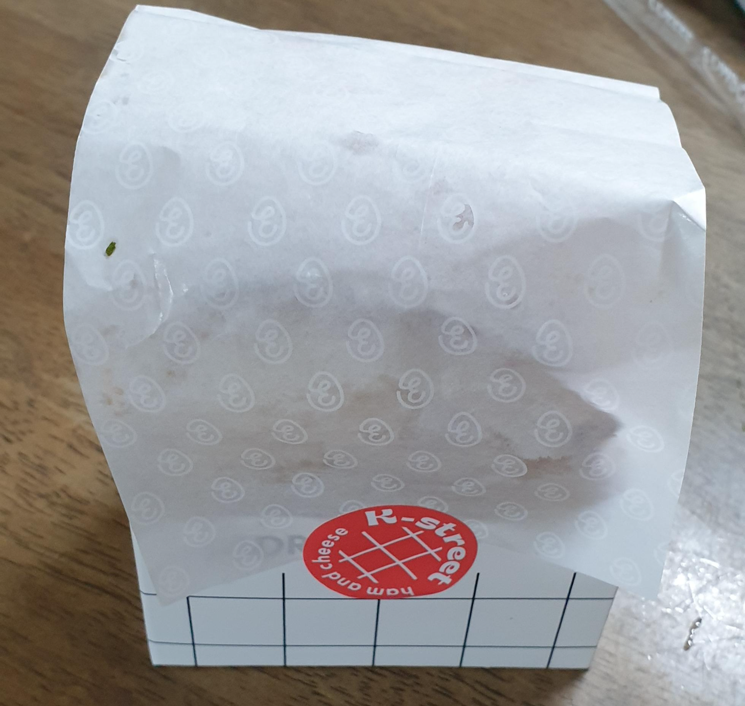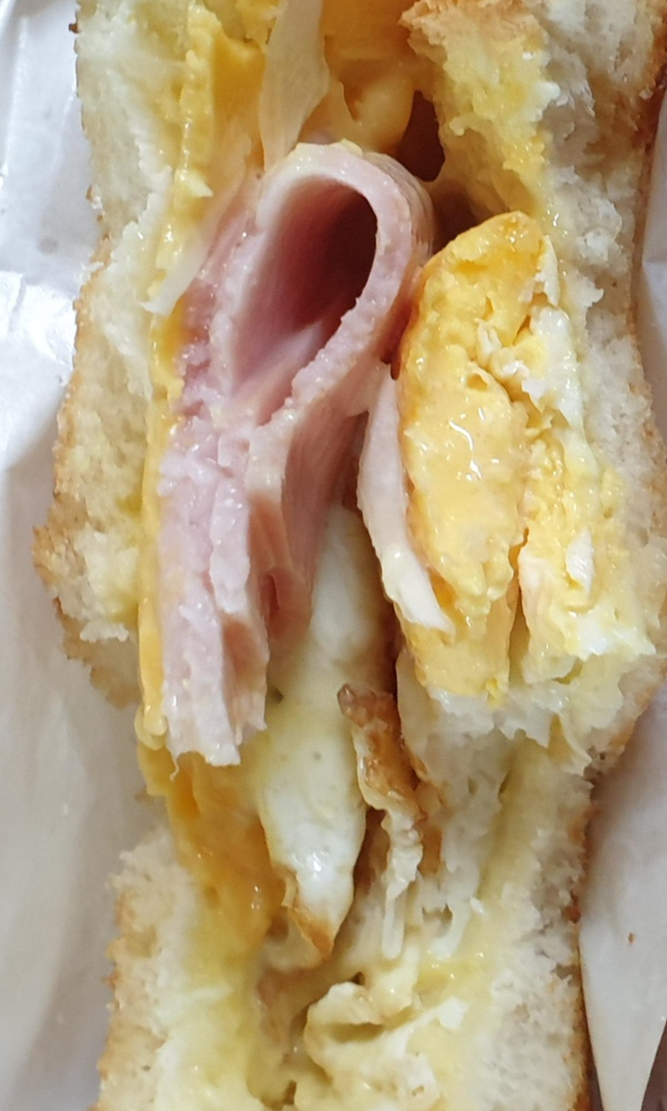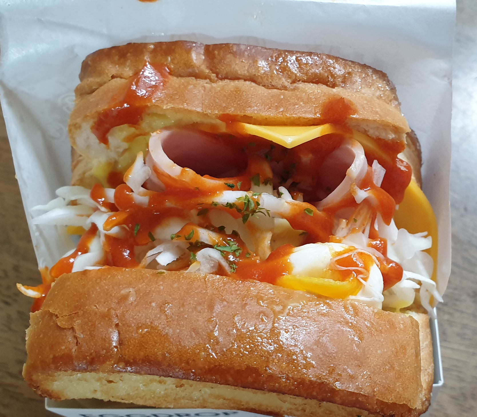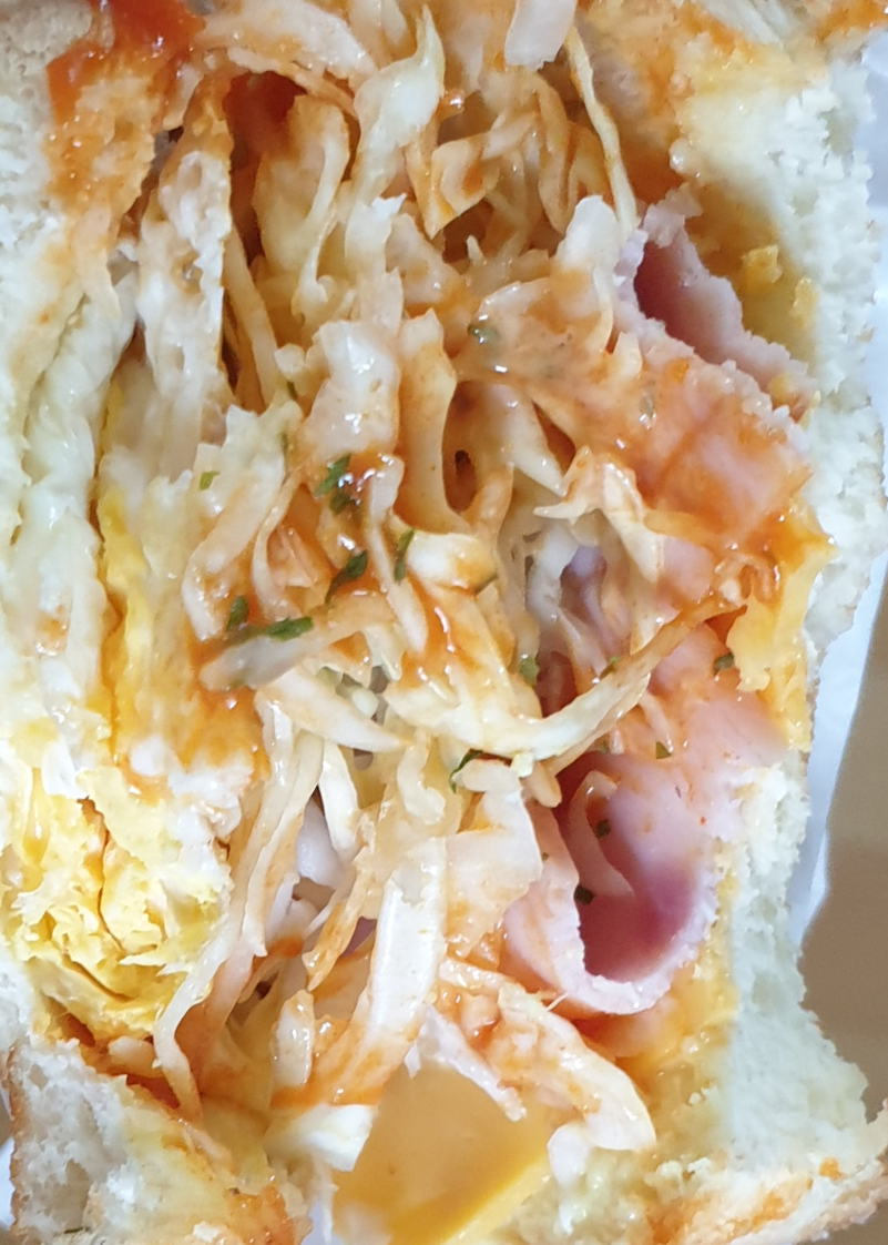 길거리 토스트라는 이름 답에 일단 케첩과 양배추가 눈에 띄네요. 그리고 햄 앤 치즈 길거리 토스트를 주문했기 때문에 행과 치즈도 보이네요.
