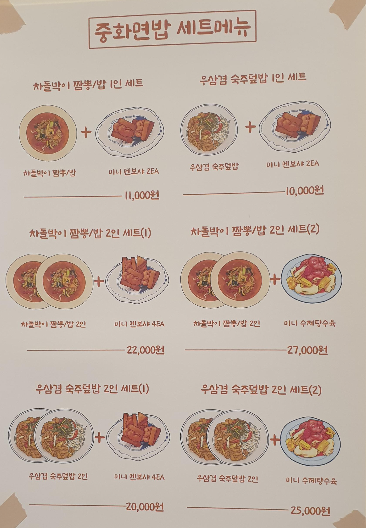 메뉴들에 대해서도 세트메뉴가 따로 있습니다. 저희는 차돌박이 짬뽕/밥 2인 세트(1)를 주문했습니다.