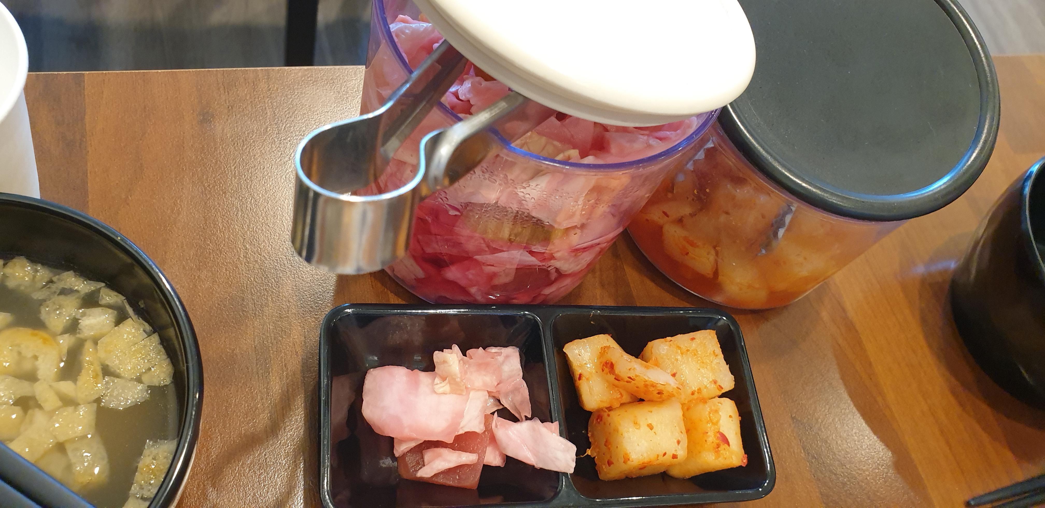 테이블엔 양배추 피클? 과 깍두기가 있습니다.