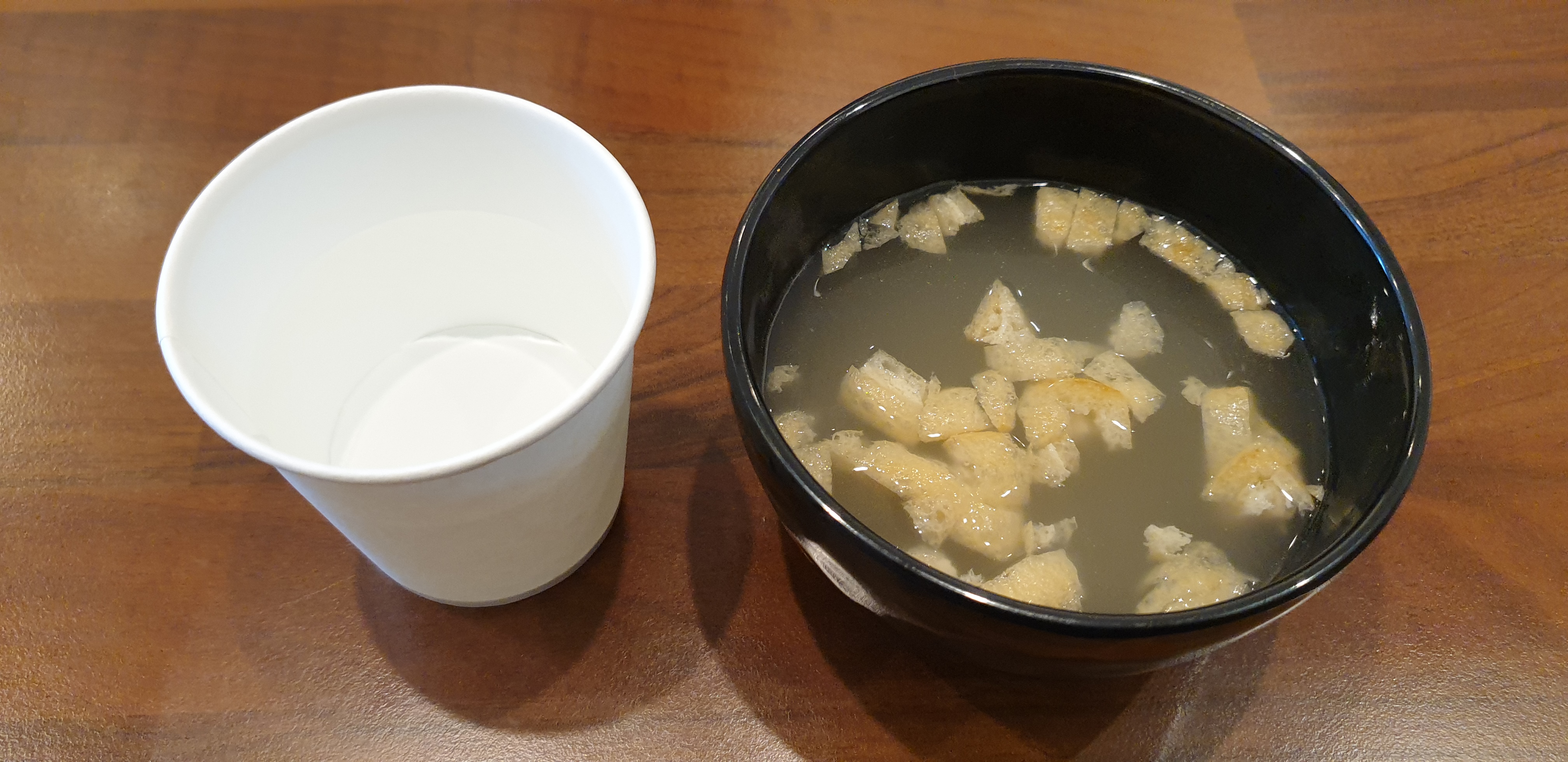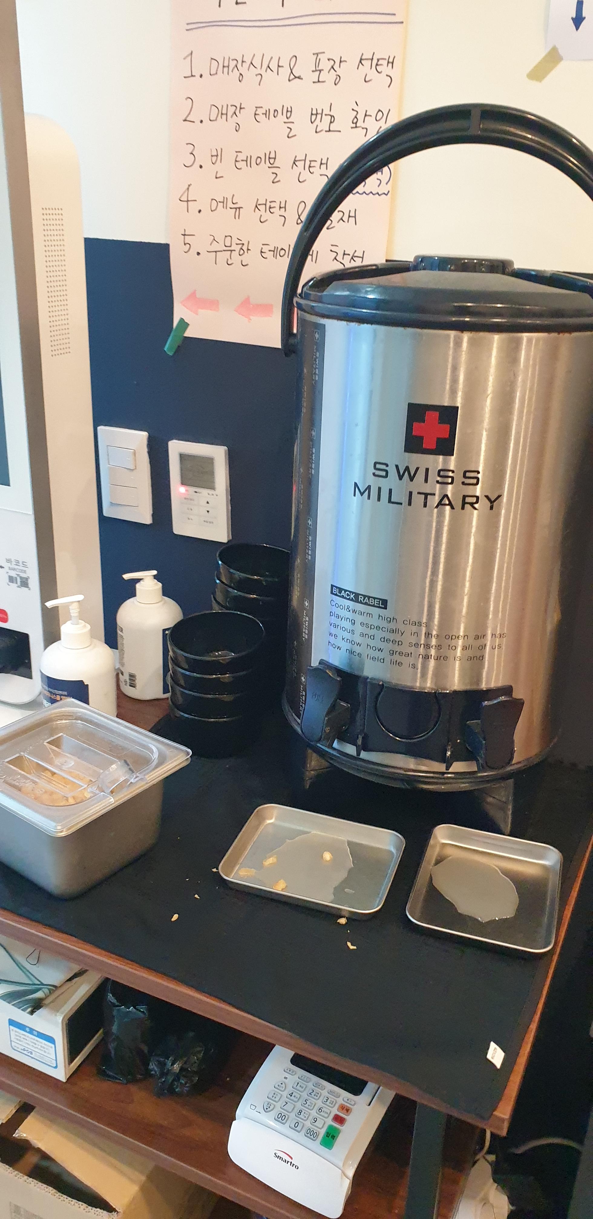 어쨌든 주문할 때 공깃밥을 추가할 수 있네요. 그리고 입구 쪽에 장국과 물을 셀프로 받도록 구비되어있네요.