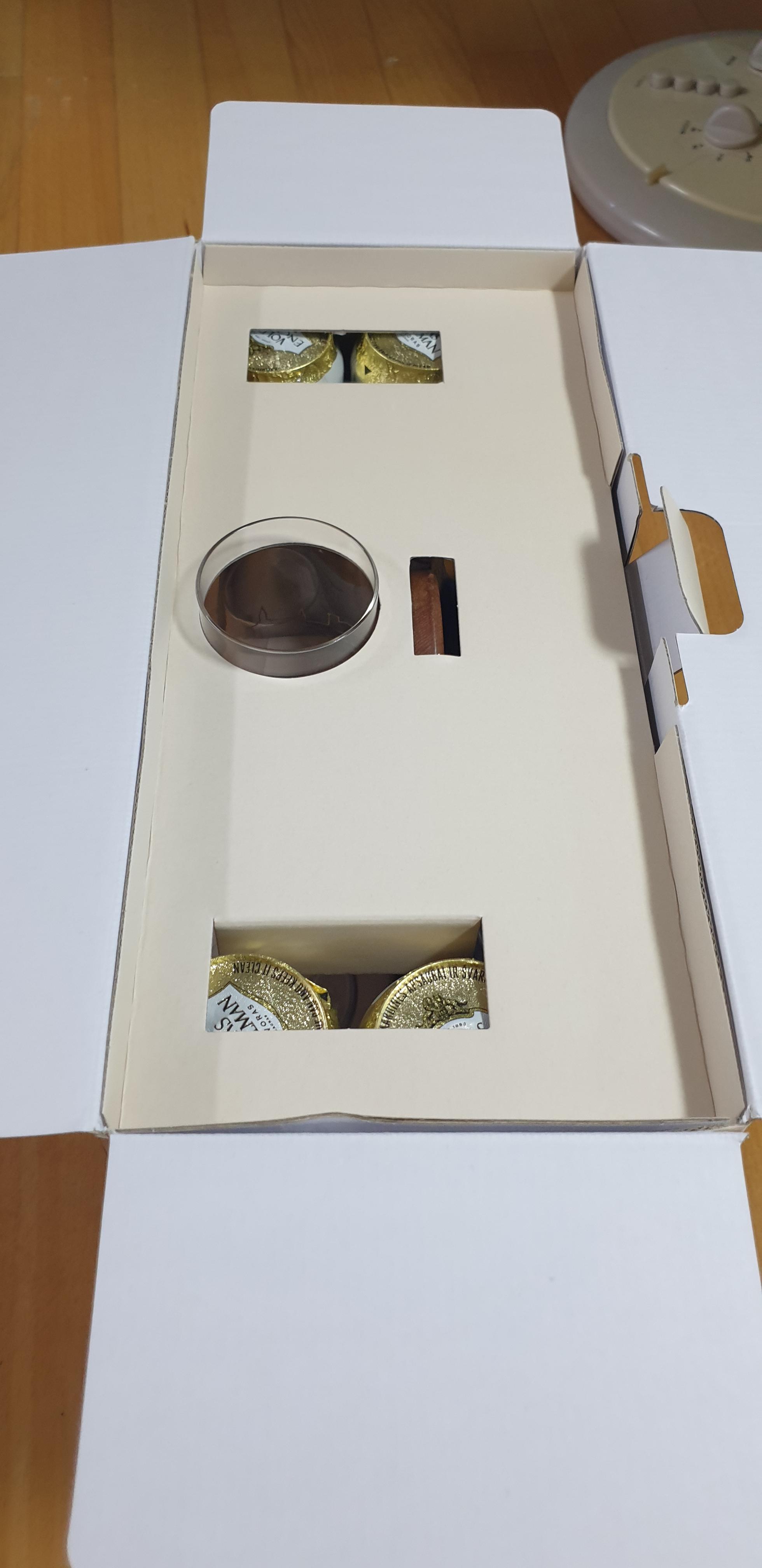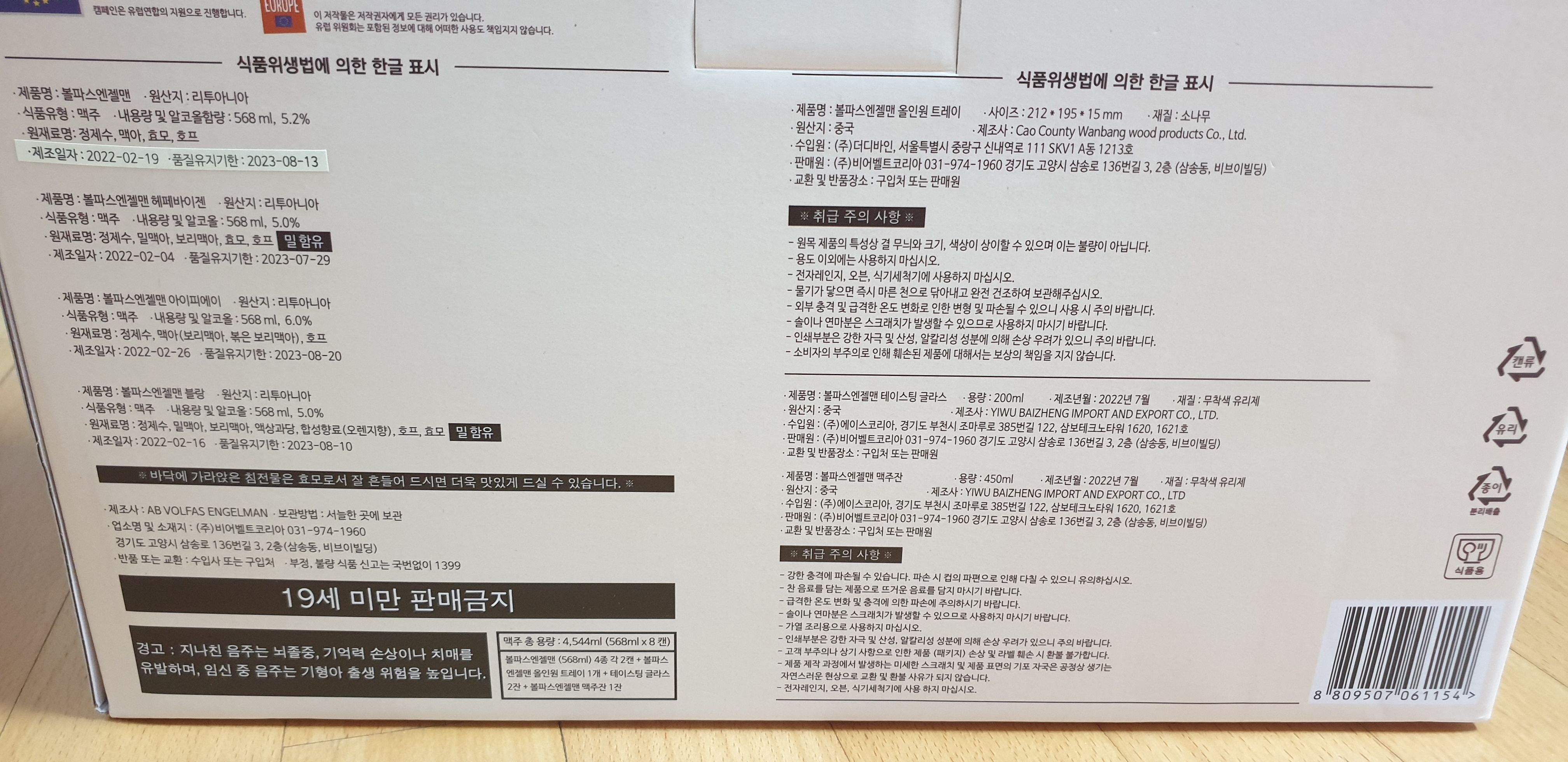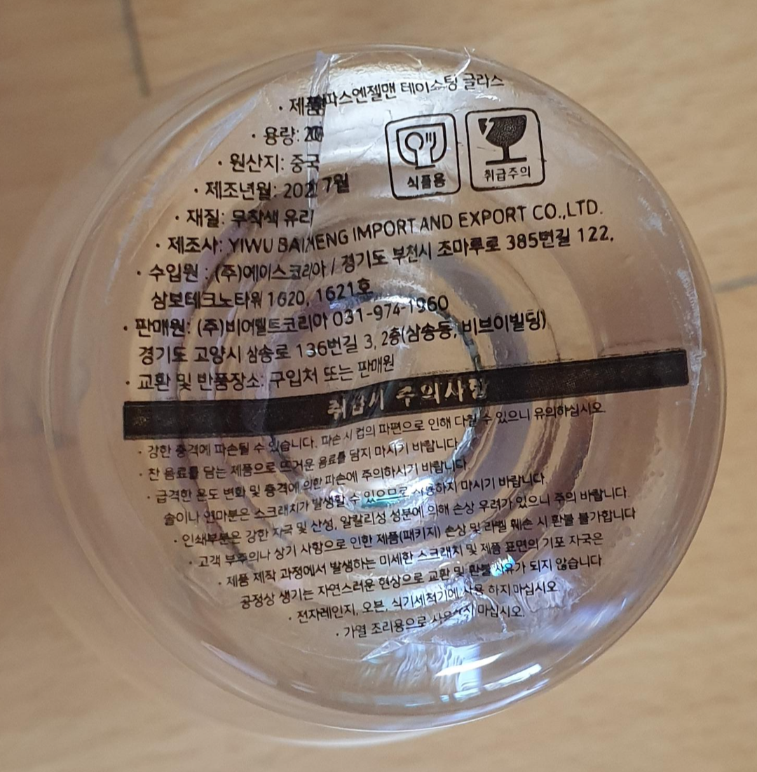 맥주잔과 시음잔 2개 그리고 목제 플레이트가 들어가 있는데 이게 박스 포장지 외부에 노출되어 있어서 그런지 약간의 스크레치가 있는 것 같습니다. 둘 다 중국 생산에 맥주잔은 450ml 용량이네요.