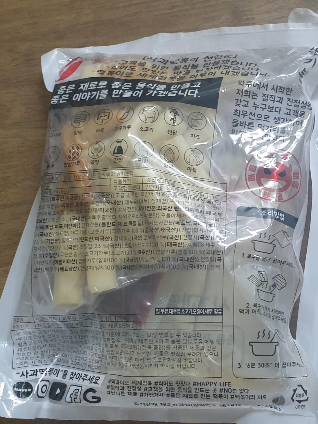 내용물을 쌀떡팩하고 동일해 보이지만 떡이 밀떡이라 모양이 약간 다르고 어묵도 쌀떡 팩은 치즈 어묵 같은 것도 있었는데 밀떡인 기본팩은 그냥 평범한 어묵만 들어있었습니다.