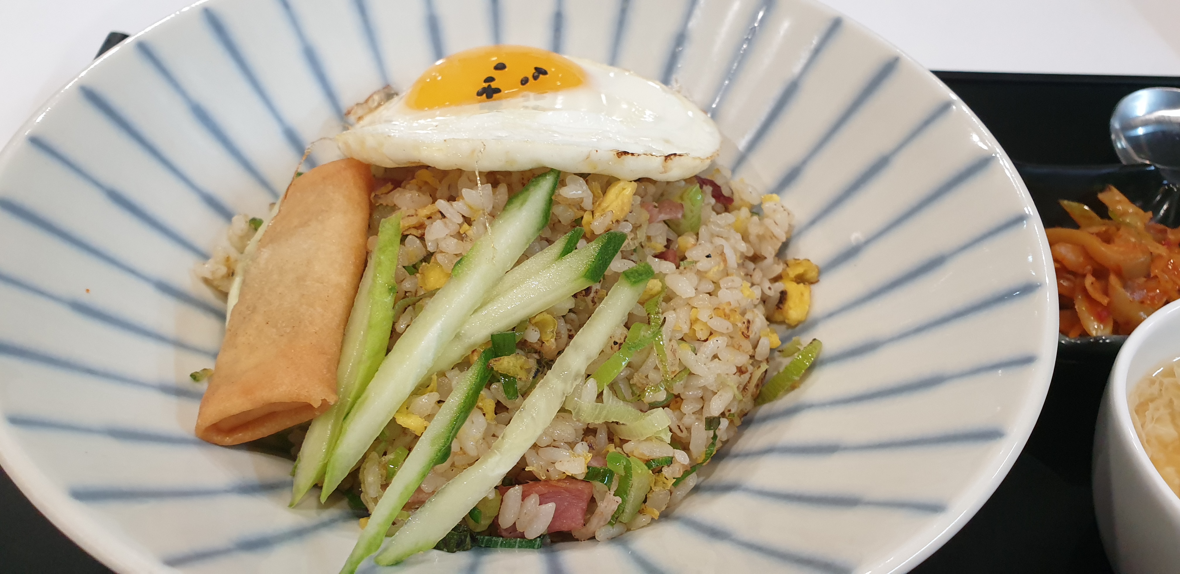 볶음밥에는 계란 프라이와 오이, 춘권 1개가 들어 있습니다.