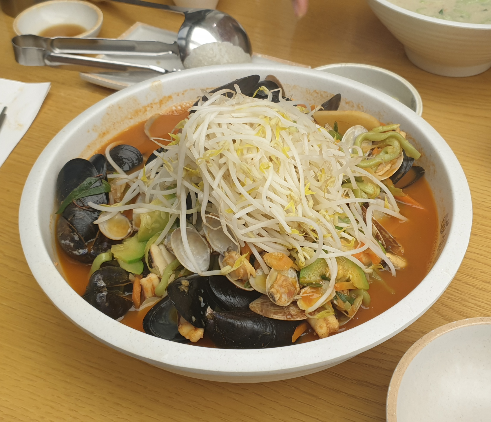 올라가 있는 숙주와 바지락, 홍합이 눈에 띕니다.