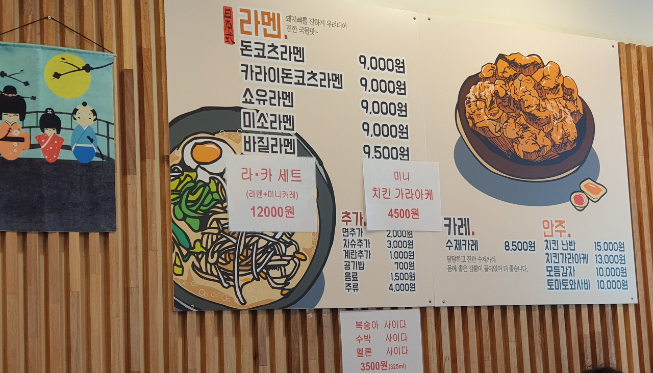저번에는 돈코츠라멘을 먹었었는데, 이번에는 카라이 돈코츠라멘(9,000원)과 미니 치킨 가라아게(4,500원)를 주문했습니다.