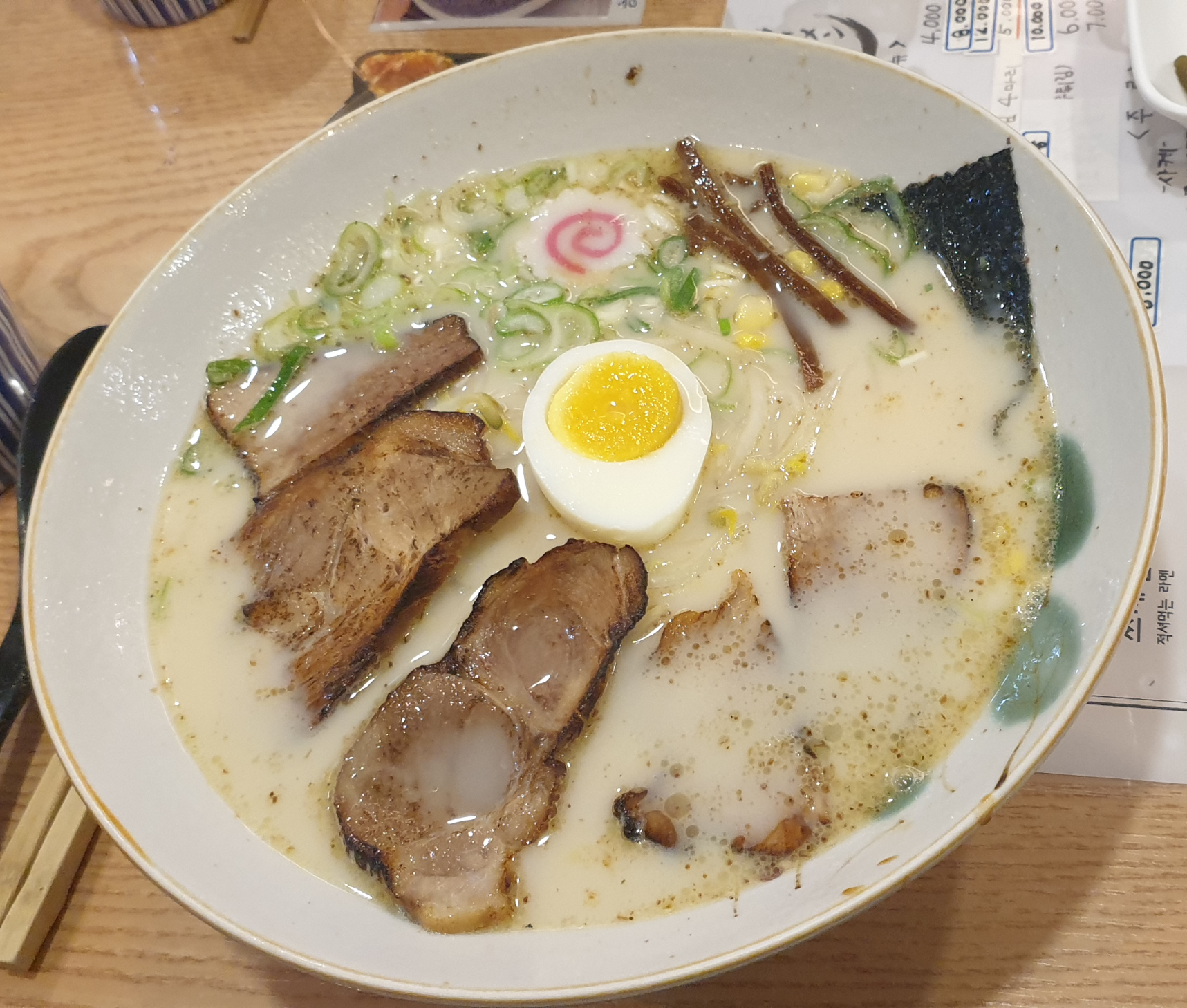 라멘의 면이 가늘어서 개인적으론 좋았습니다. 국물 맛도 돈코츠 베이스에 간장이 들어가서 그런지 짭짤해서 맛있었습니다.
