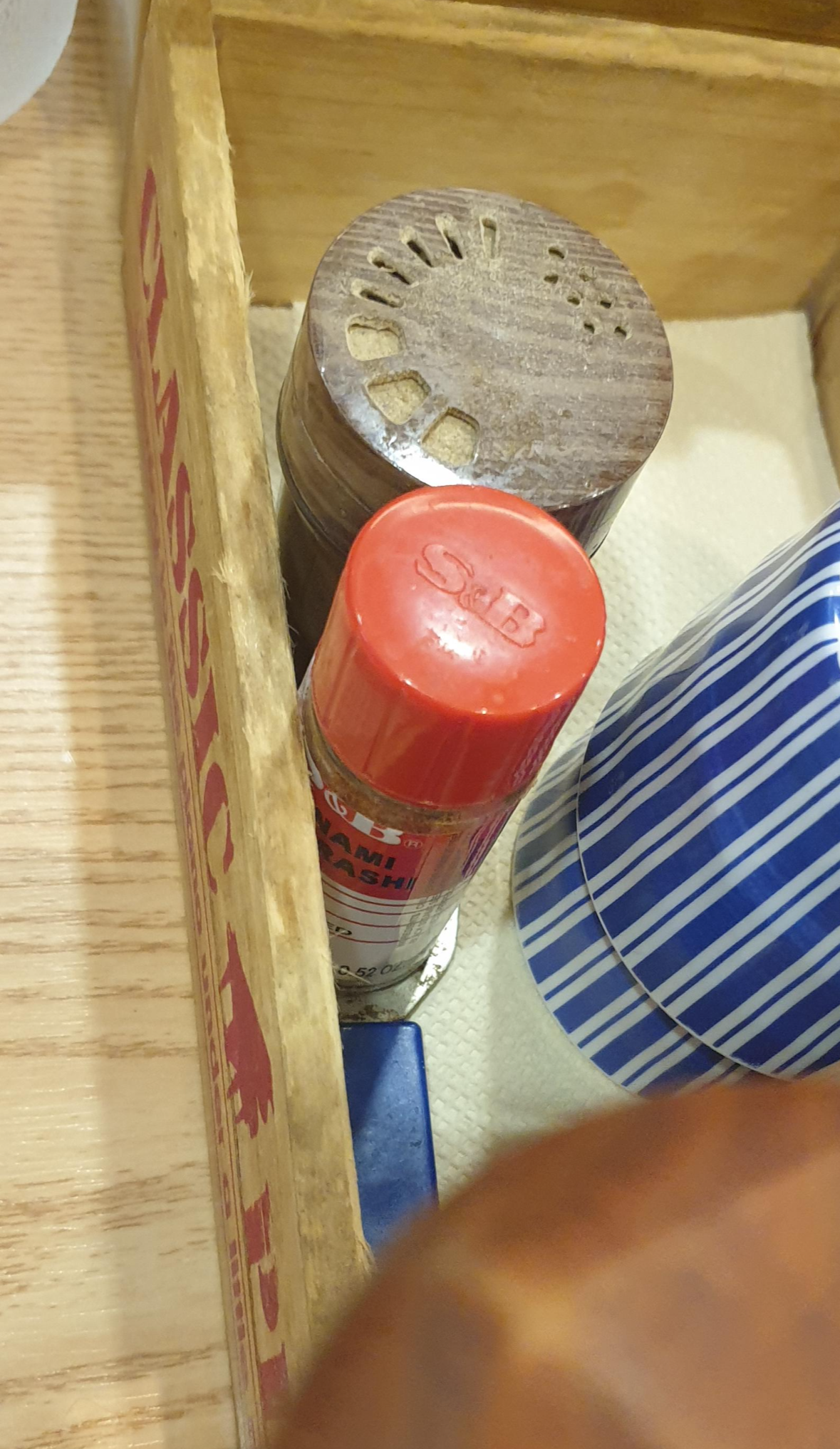 테이블에는 후추와 시치미가 비치되어 있고, 반찬은 산고추절임, 김치, 단무지가 있습니다.