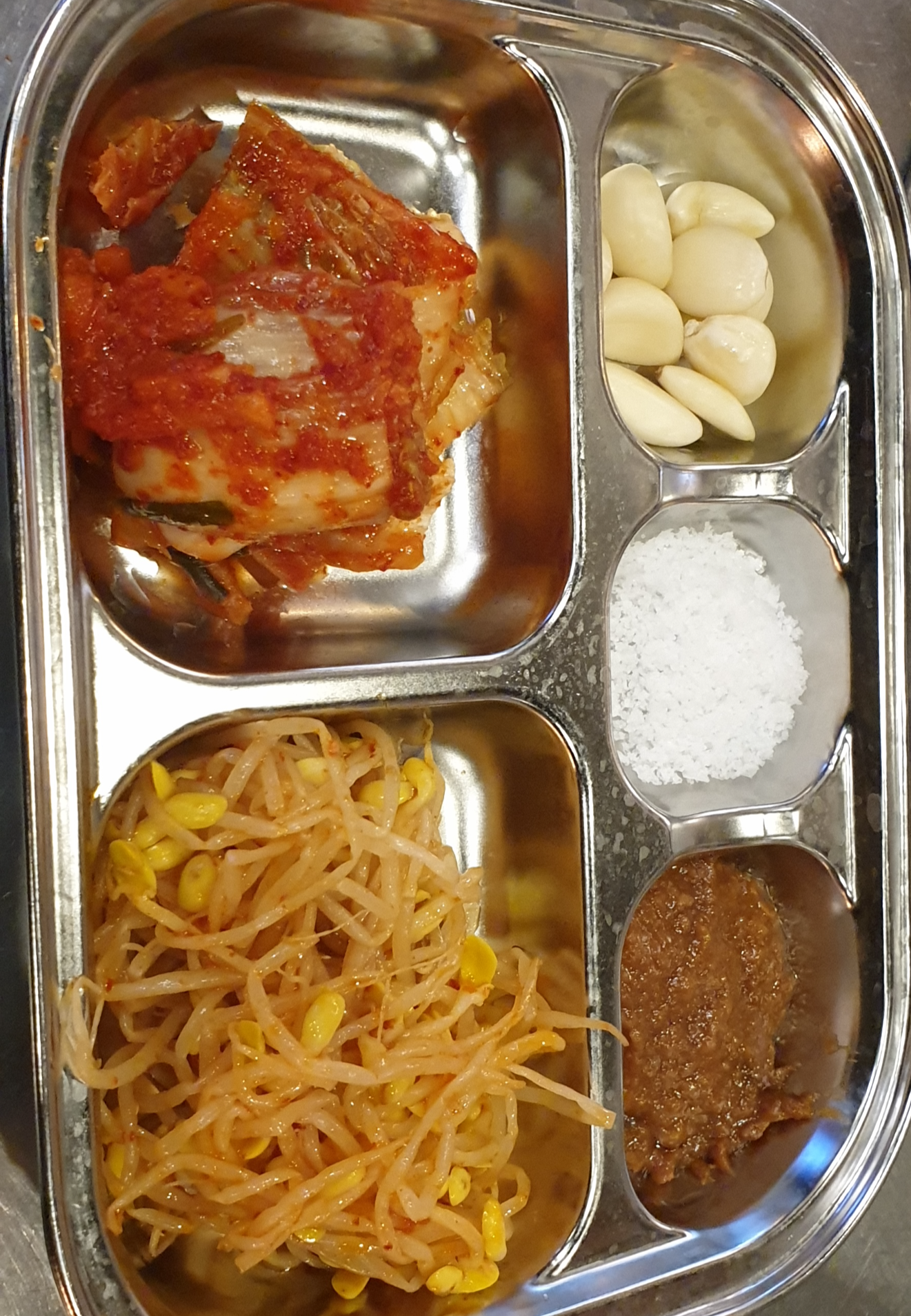 쌈장이나 김치 같은 반찬들이 미니 식판에 나옵니다.