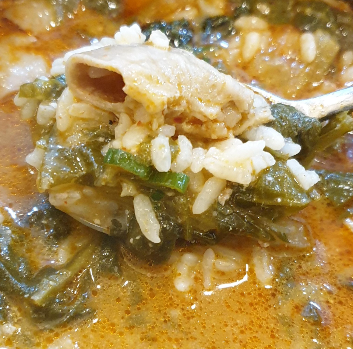 안에는 곱창과 깻잎 시레기가 들어있네요. 깻잎을 별로 안 좋아하는 저지만, 깻잎 맛이 다른 강한 맛에 약하게 묻혀서 맛있게 먹었습니다. 곱창도 꽤 들어있고 곱창이랑 우거지도 질기지 않아서 좋았고, 잡채를 양껏 먹을 수 있다는 점도 좋았습니다.