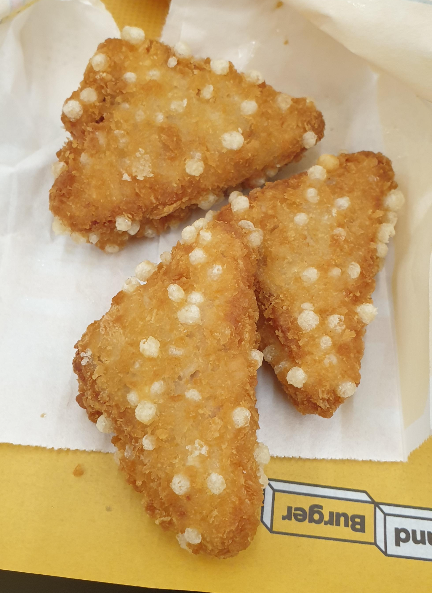 예전에 롯데리아에서 먹던 오징어버거 패티의 오징어를 좀 굵게 만든 느낌일까요. 감자튀김을 다른 패스트푸드점처럼 치즈스틱으로 바꿀 수 있으면 좋겠네요.