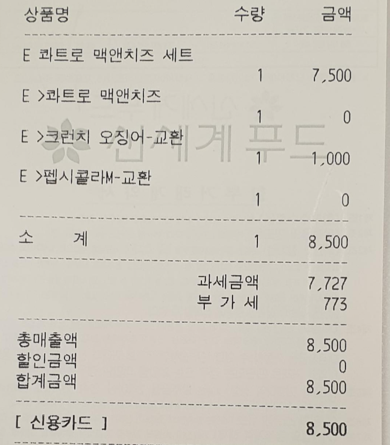 뭘 먹을까 고민하다 키오스크 옆에 있는 콰트로 맥엔치즈 세트 주문 시 베이컨 토핑을 추가해준다는 내용을 보고 콰트로 맥엔치즈 세트를 주문했습니다. 감자튀김을 안 좋아하기 때문에 크런치 오징어를 추가금 1,000원을 내고 바꿨습니다.