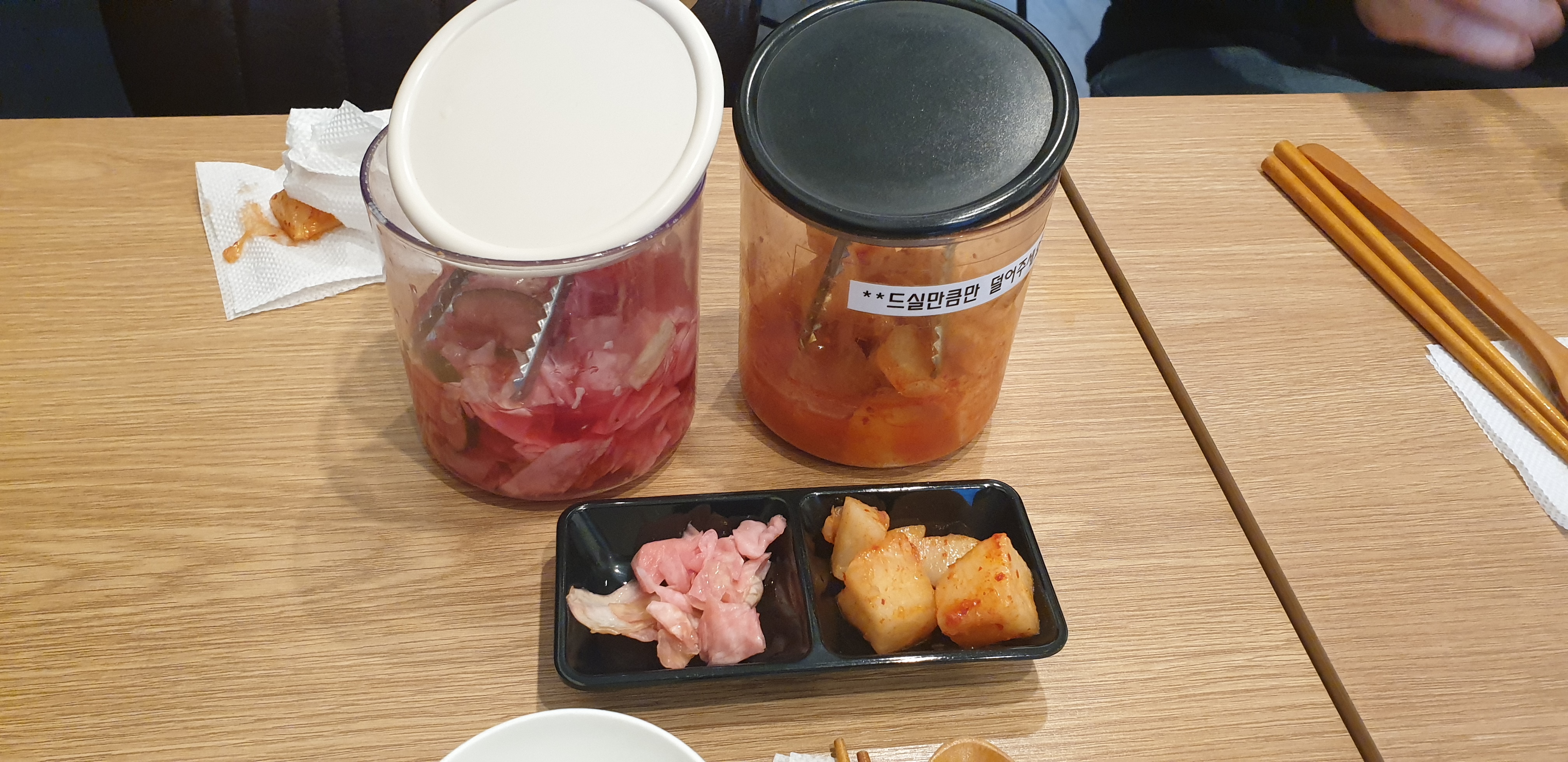 반찬으로 양배추 피클과 깍두기가 테이블에 비치되어있습니다.