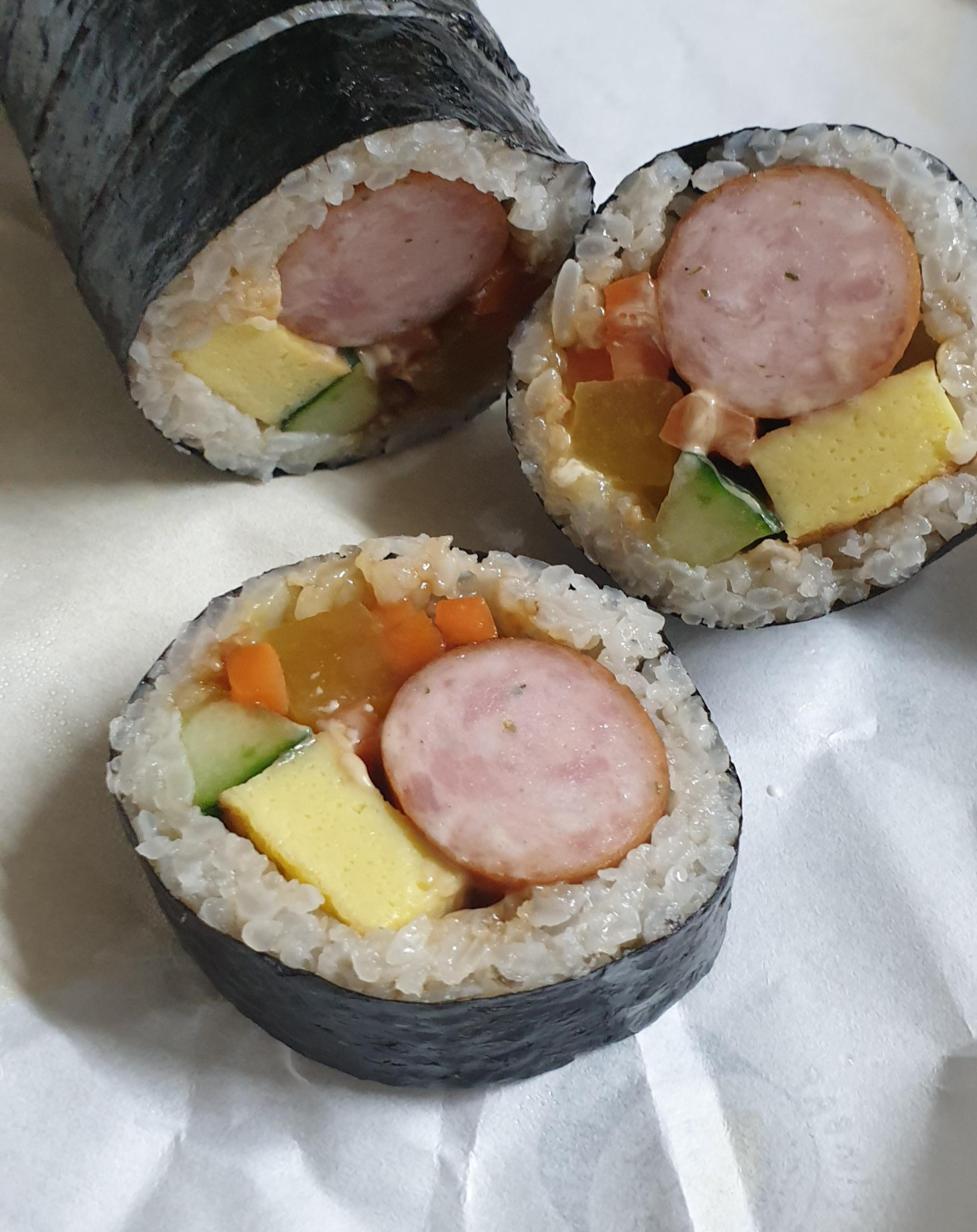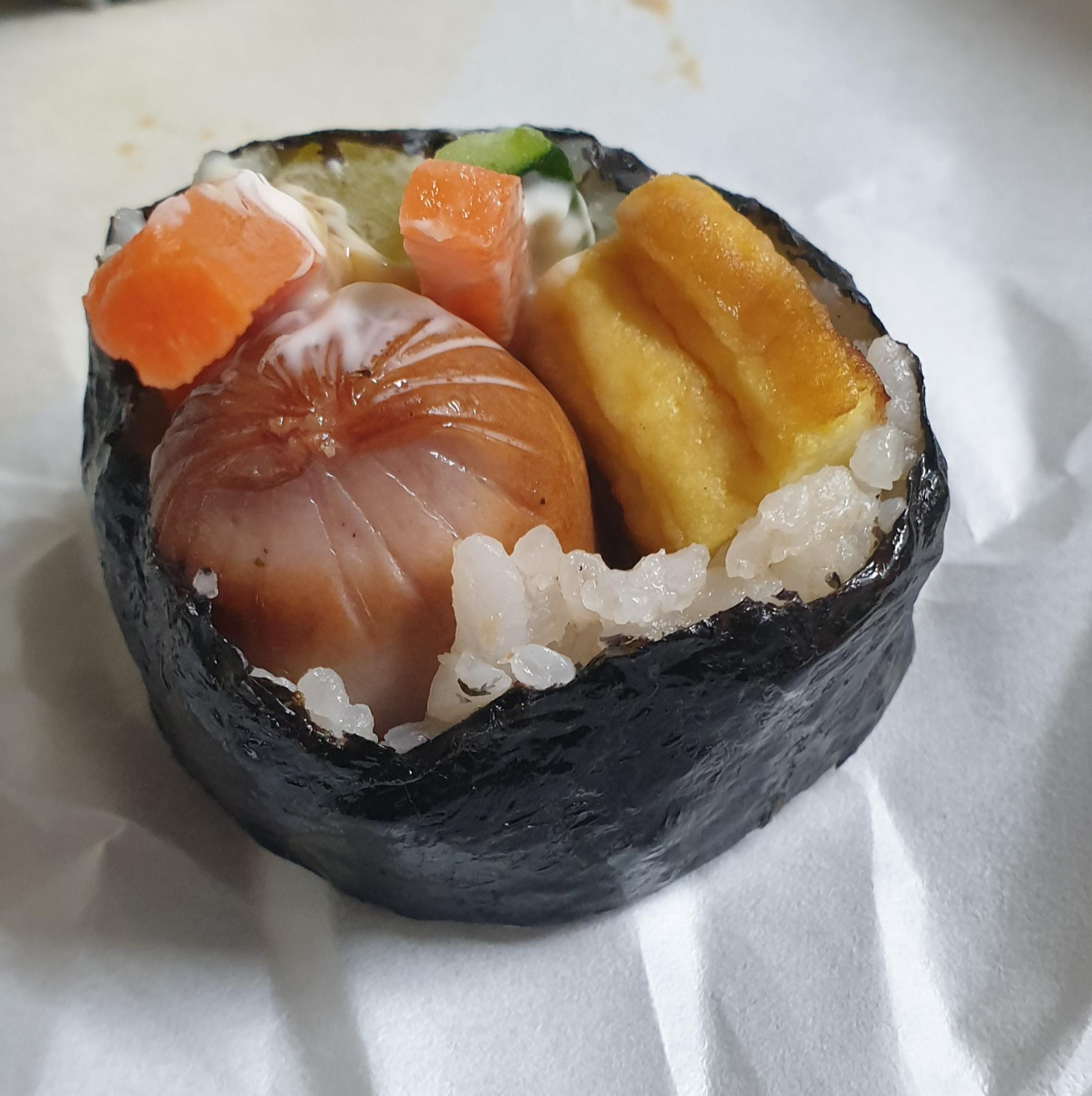 핫도그 김밥은 안에 두꺼운 소시지가 들어 있습니다. 그리고 마요네즈도 들어있는 것 같습니다.