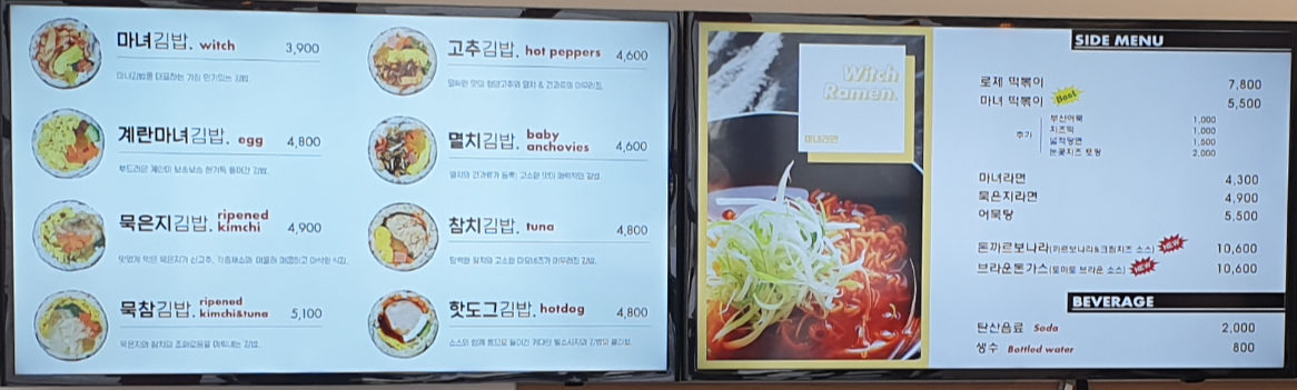 저번엔 가장 기본적인 마녀 김밥만 먹어봤는데 이번에는 마녀 김밥(3,900원)과 핫도그 김밥(4,800원)을 포장했습니다.