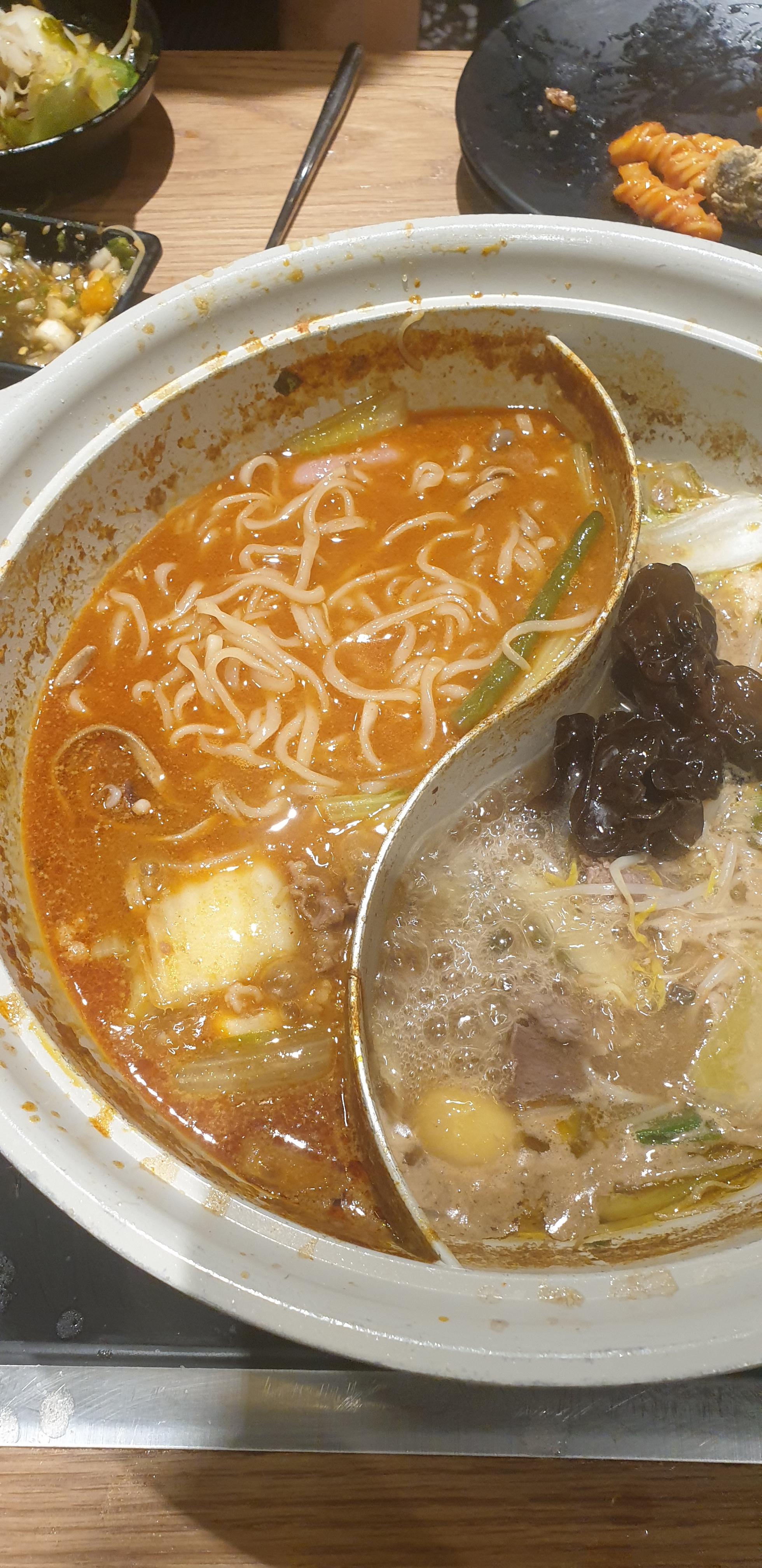 일반적으론 냄비지만 추가금을 내면 훠궈 냄비처럼 반 갈라져 있는 냄비로 2가지 육수를 맛볼 수 있습니다.