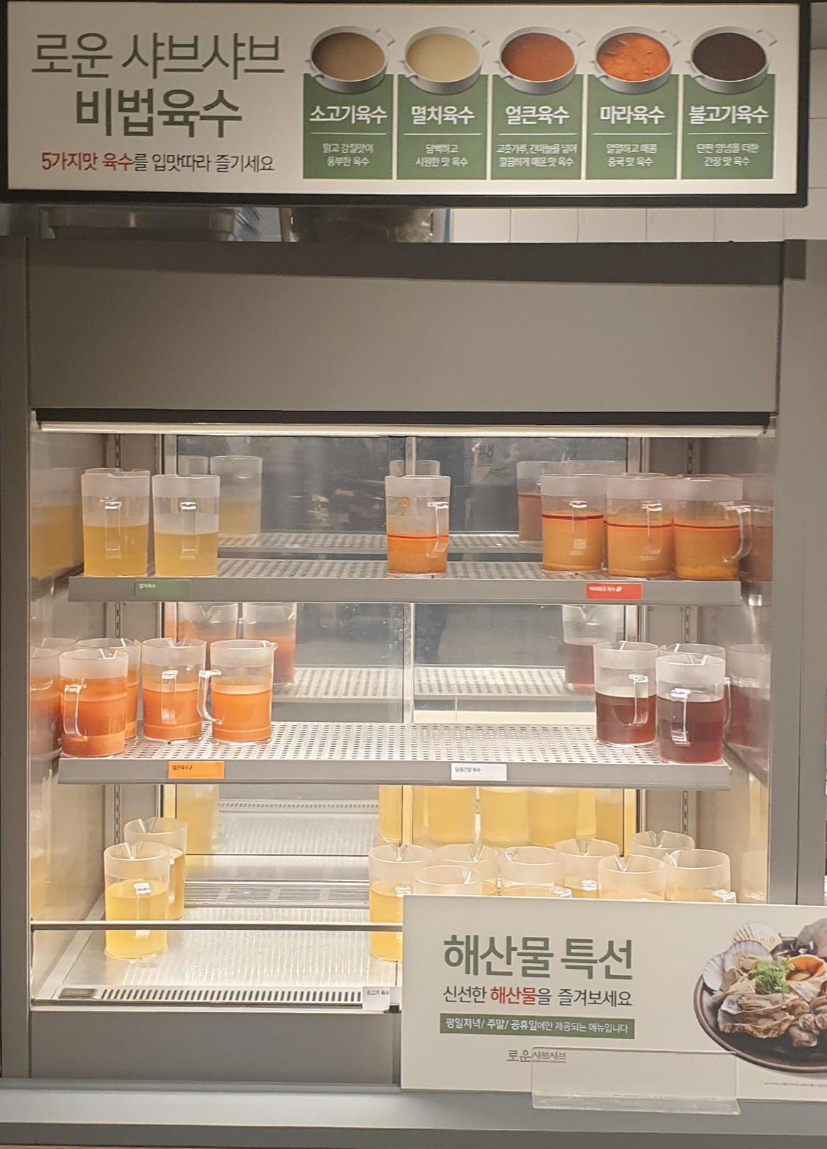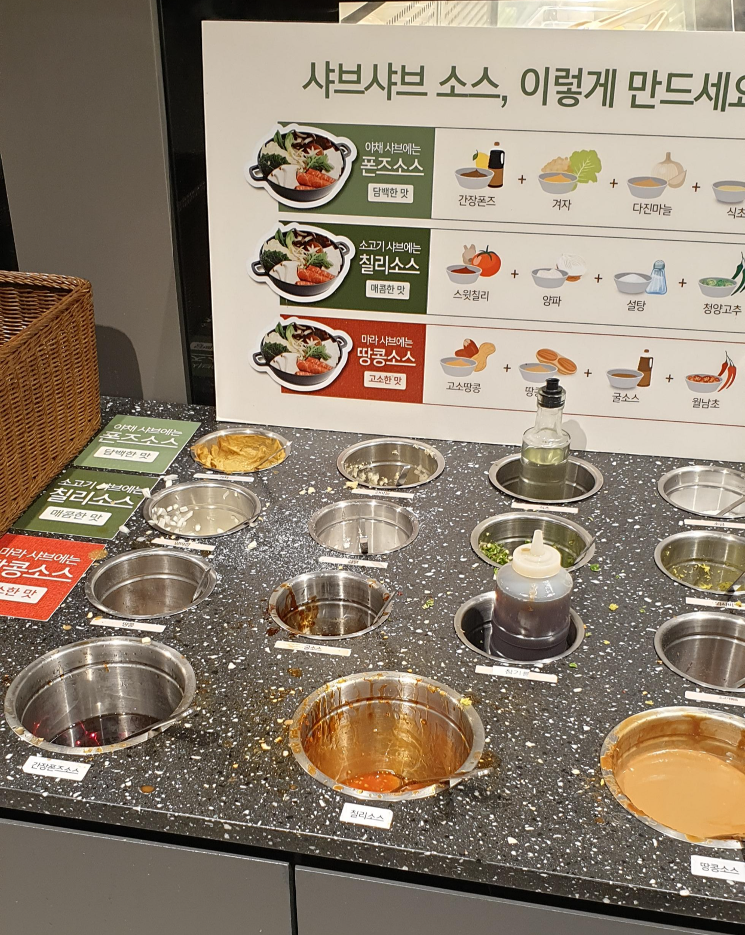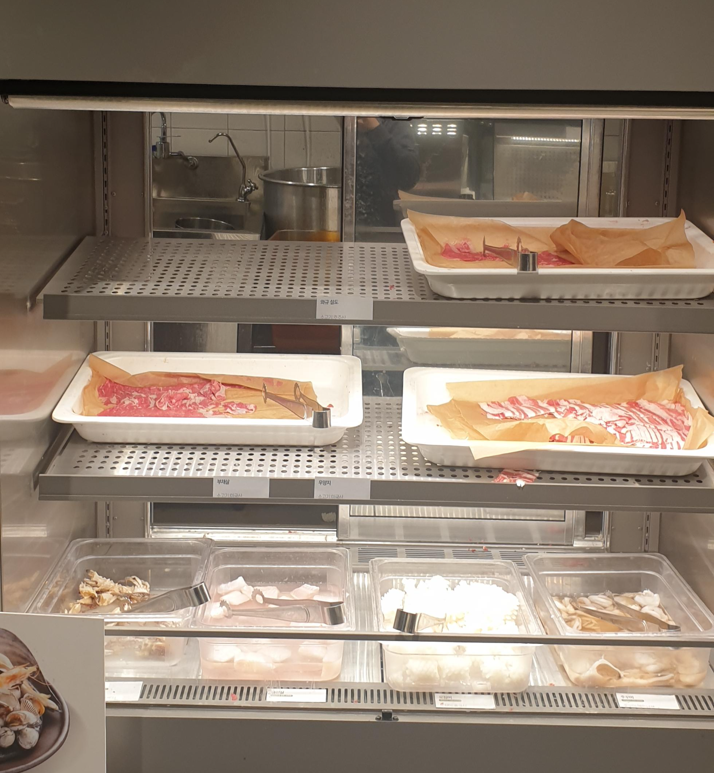 일단 자리에 안내가 되고 육수를 가지려 갔습니다. 육수는 소고기, 멸치, 얼큰, 마라, 불고기 육수 5가지가 있었는데 저희는 무난하게 소고기 육수와 얼큰 육수로 골랐습니다. 그리고 육수 옆에 고기 코너에는 고기 3종류(기억이 잘 안 나네요.)와 생선살, 냉동 주꾸미, 꽃게, 오징어가 있었습니다. 그리고 샤부샤부용 야채들과 샤브샤브용 소스 코너도 따로 있었어요.