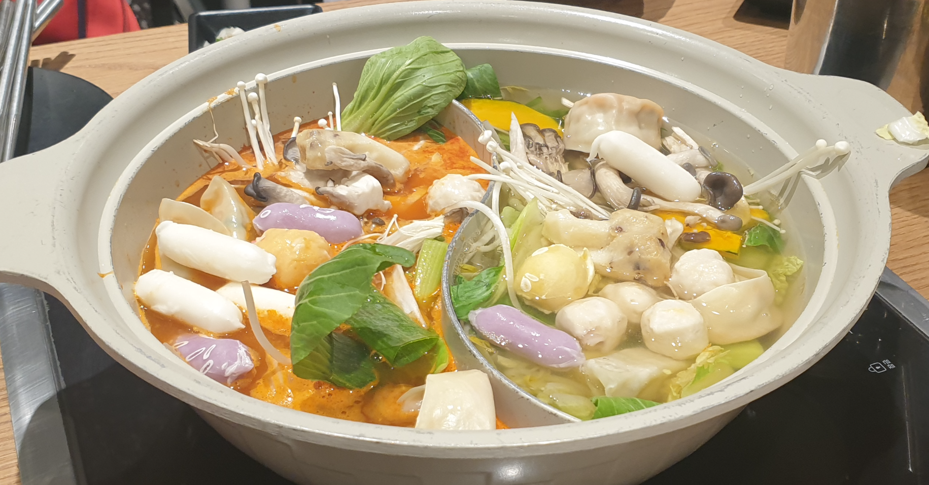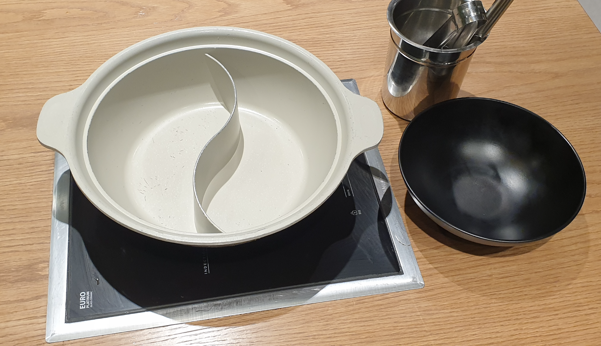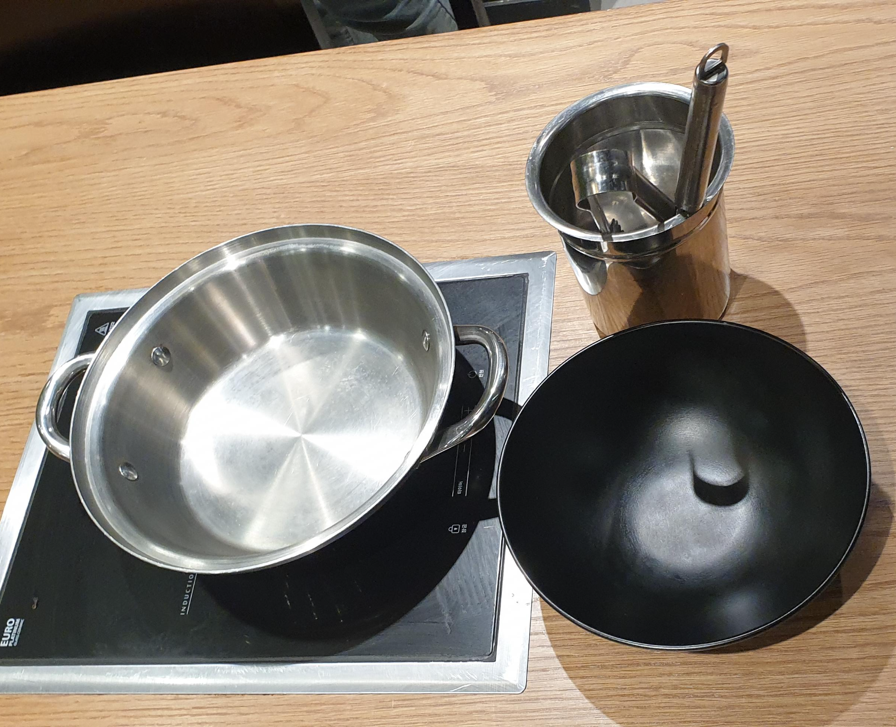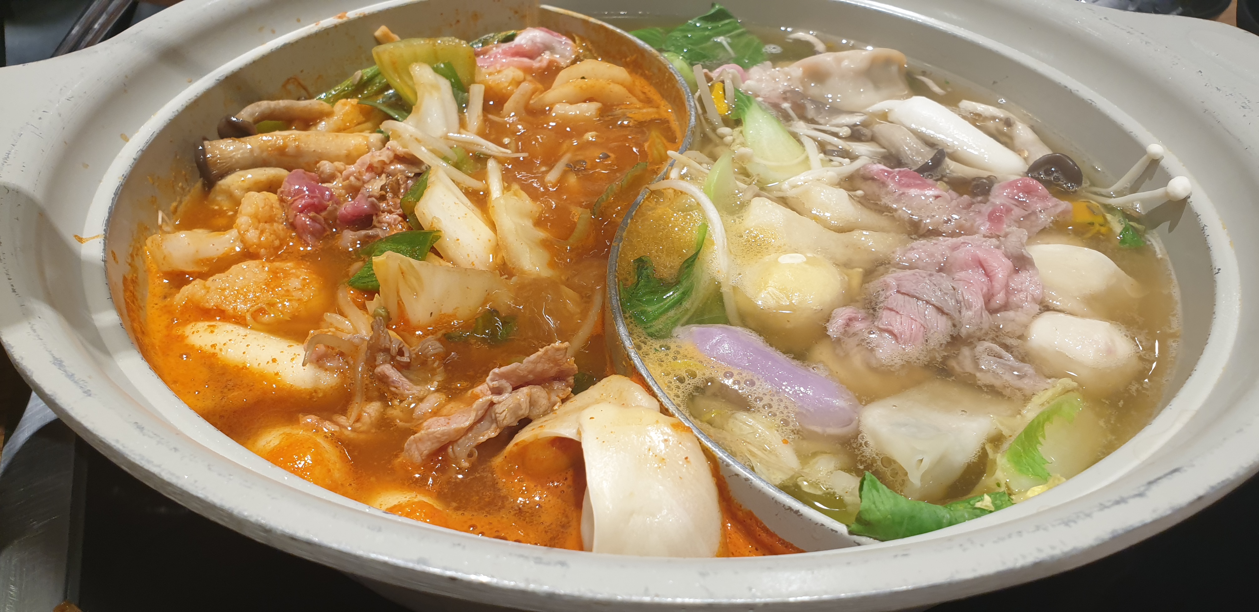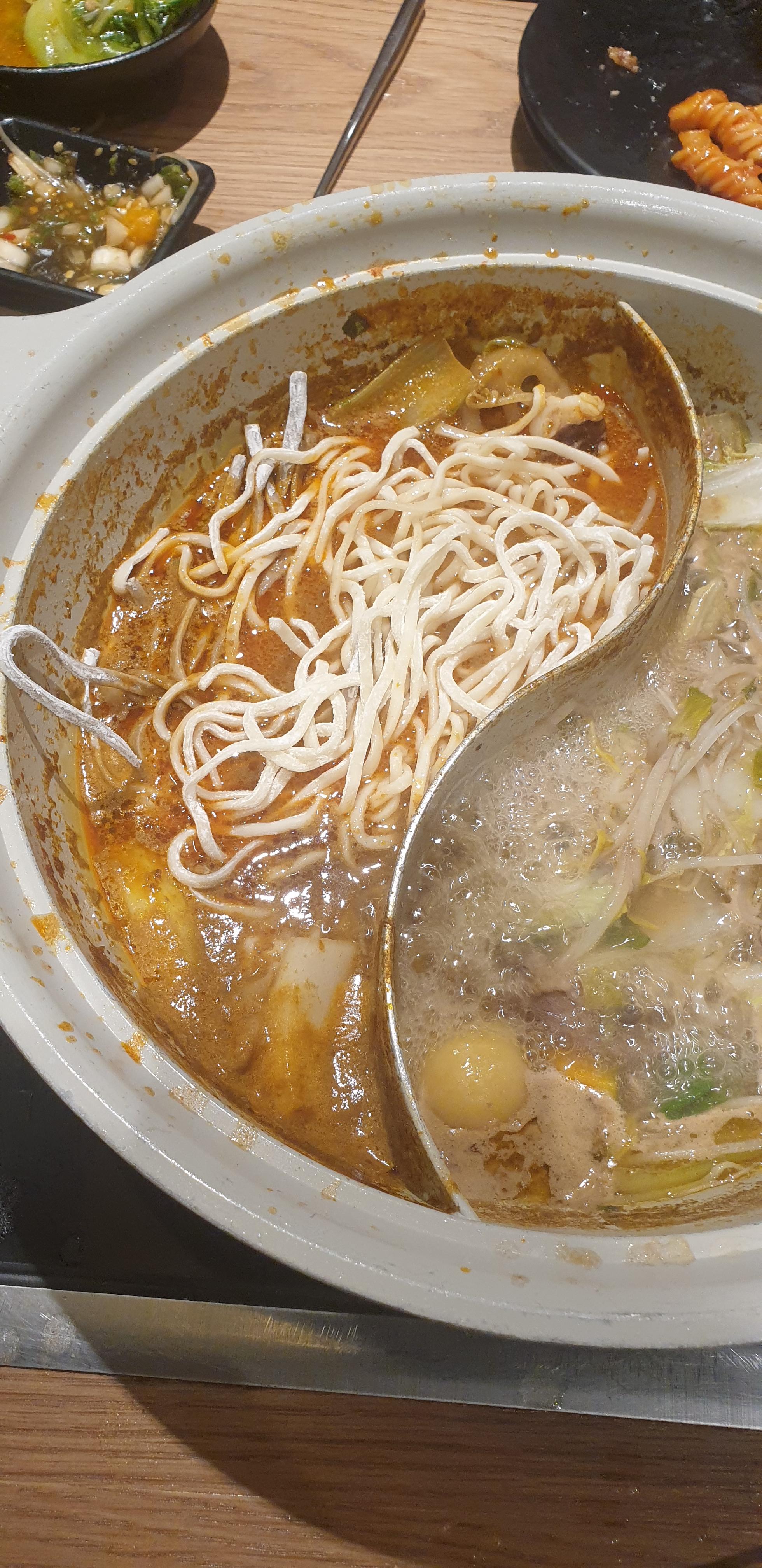 일반적으론 냄비지만 추가금을 내면 훠궈 냄비처럼 반 갈라져 있는 냄비로 2가지 육수를 맛볼 수 있습니다.