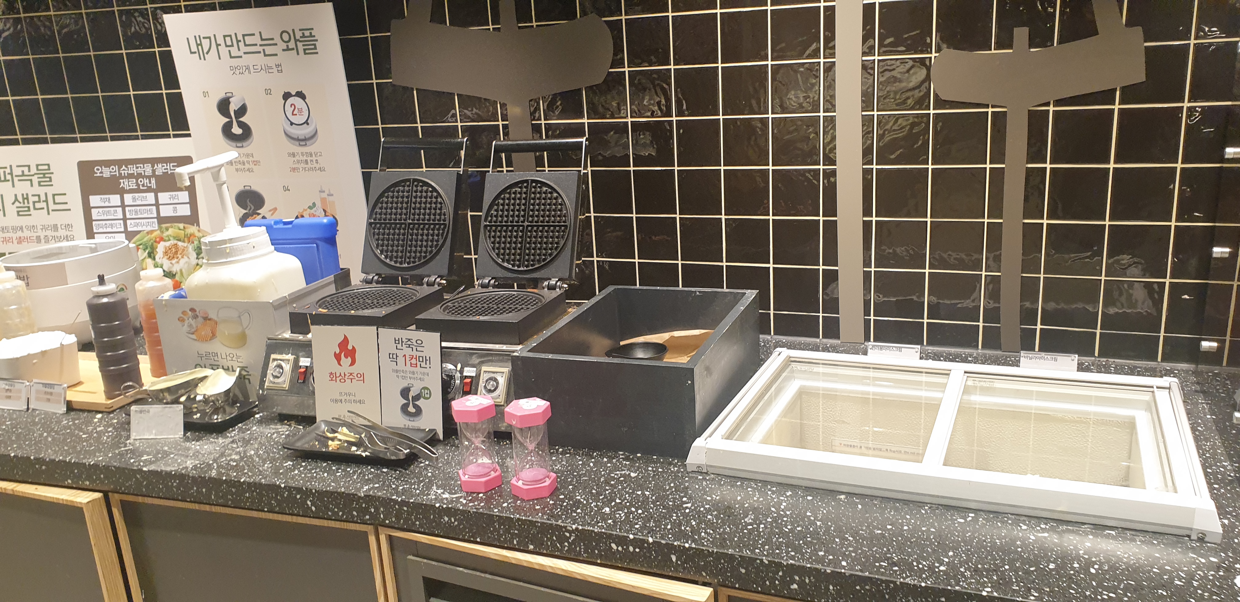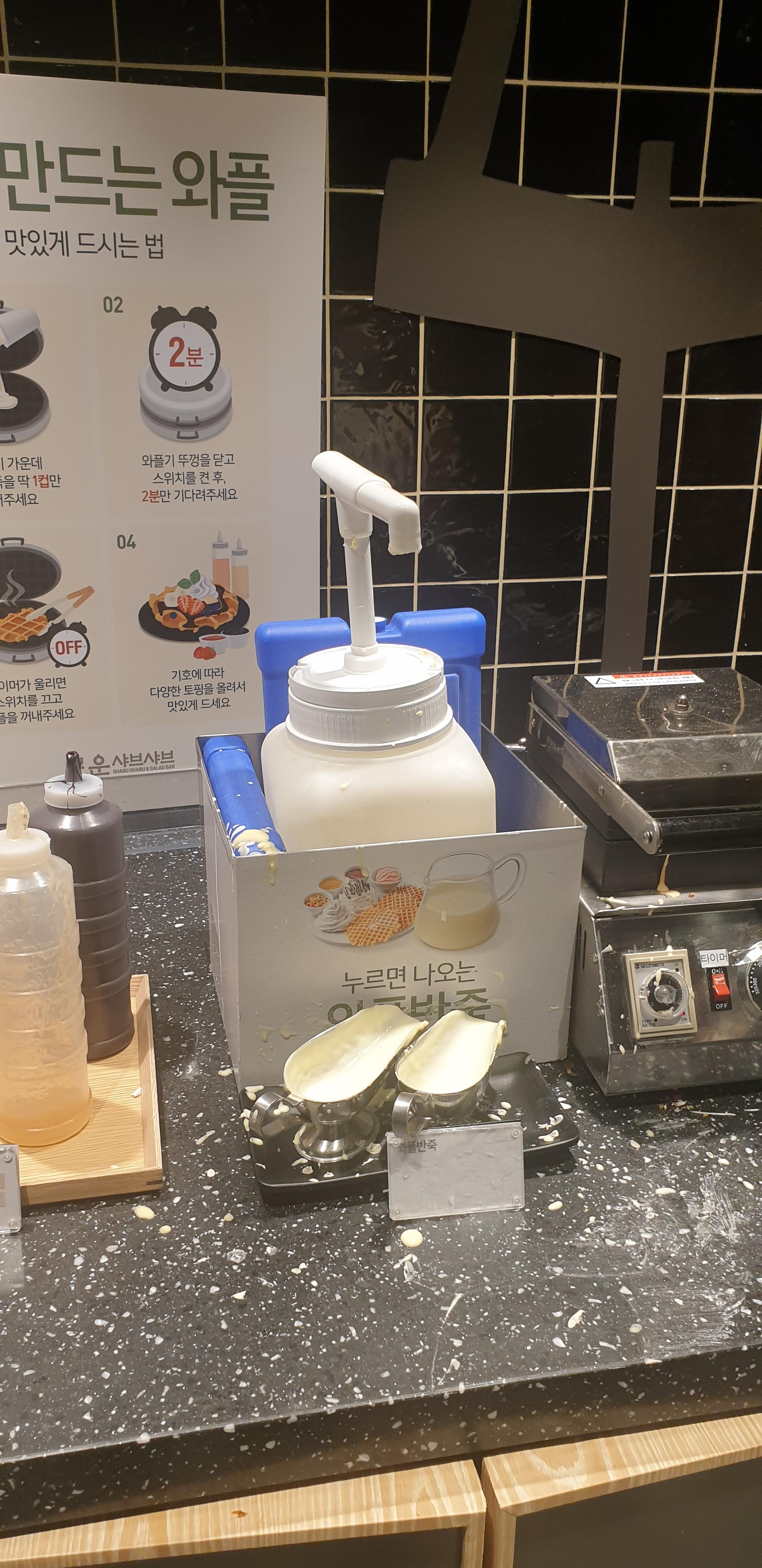 와플은 반죽을 펌프로 한 컵 짜서 반죽을 넣고 스위치를 켜면 2분 뒤에 소리가 나는데 그때 열면 완성이 되더군요.