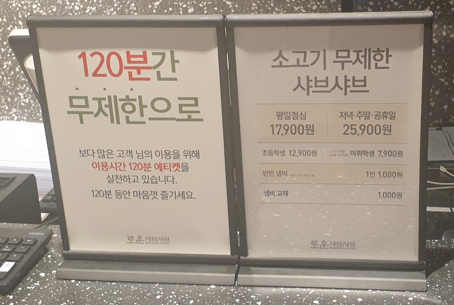 120분 소고기 무제한 샤브샤브로 주말 저녁이라 인당 25,900원이었습니다 그나저나 반반 냄비 교체가 인당 1,000원이네요. 냄비는 한 개만 바꾸는 거면서 인당 금액 책정이라니... 육수를 두 종류로 먹으면 더 많이 먹을까 봐 그런 걸까요?
