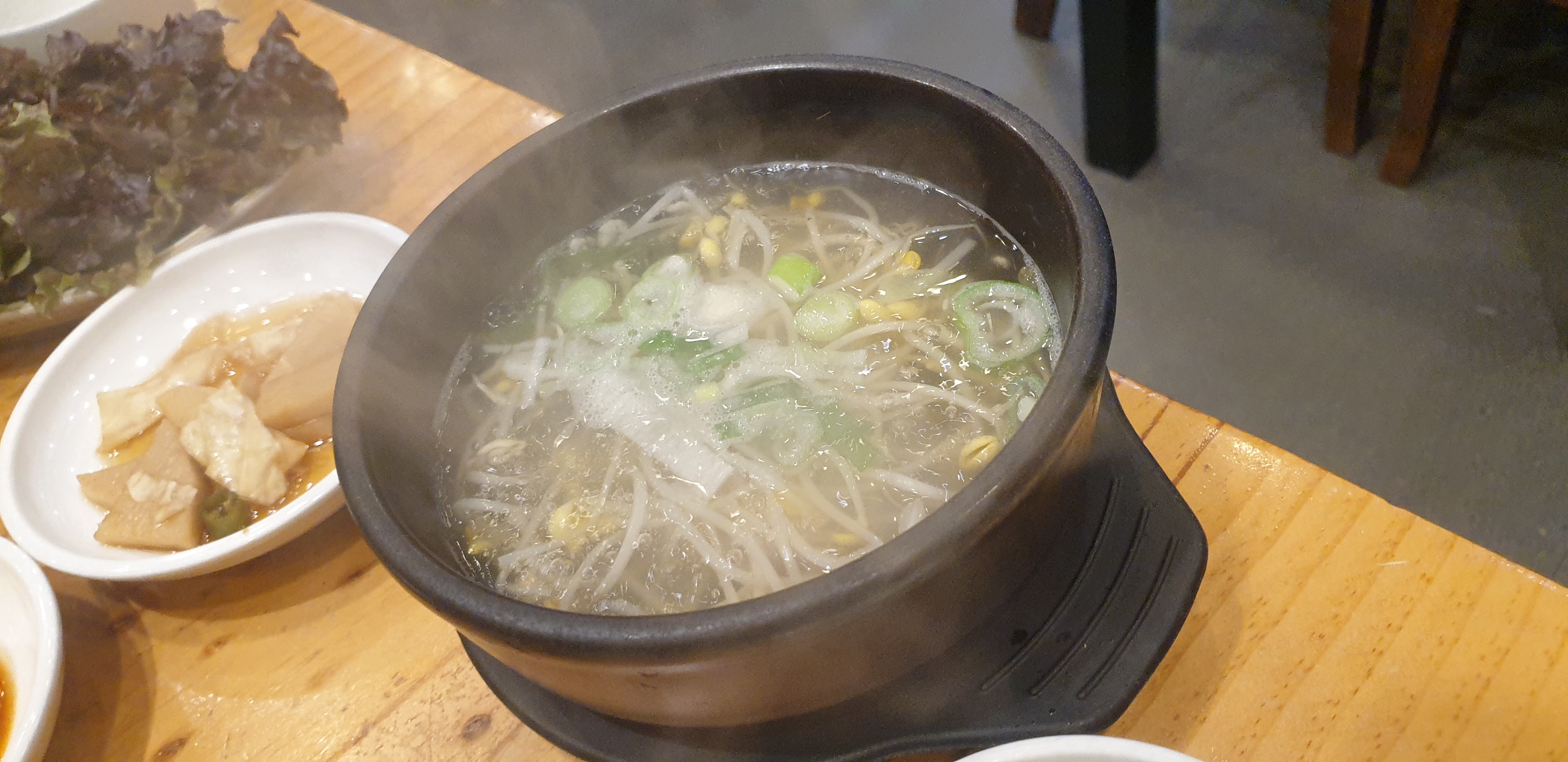잎을 절인 저건 짤 것 같아서 안 먹어봤습니다. 그리고 콩나물국이 나옵니다. 순두부의 양념장도 그렇고 계란찜도 그렇고 전체적으로 간이 좀 쌘 것 같았습니다.