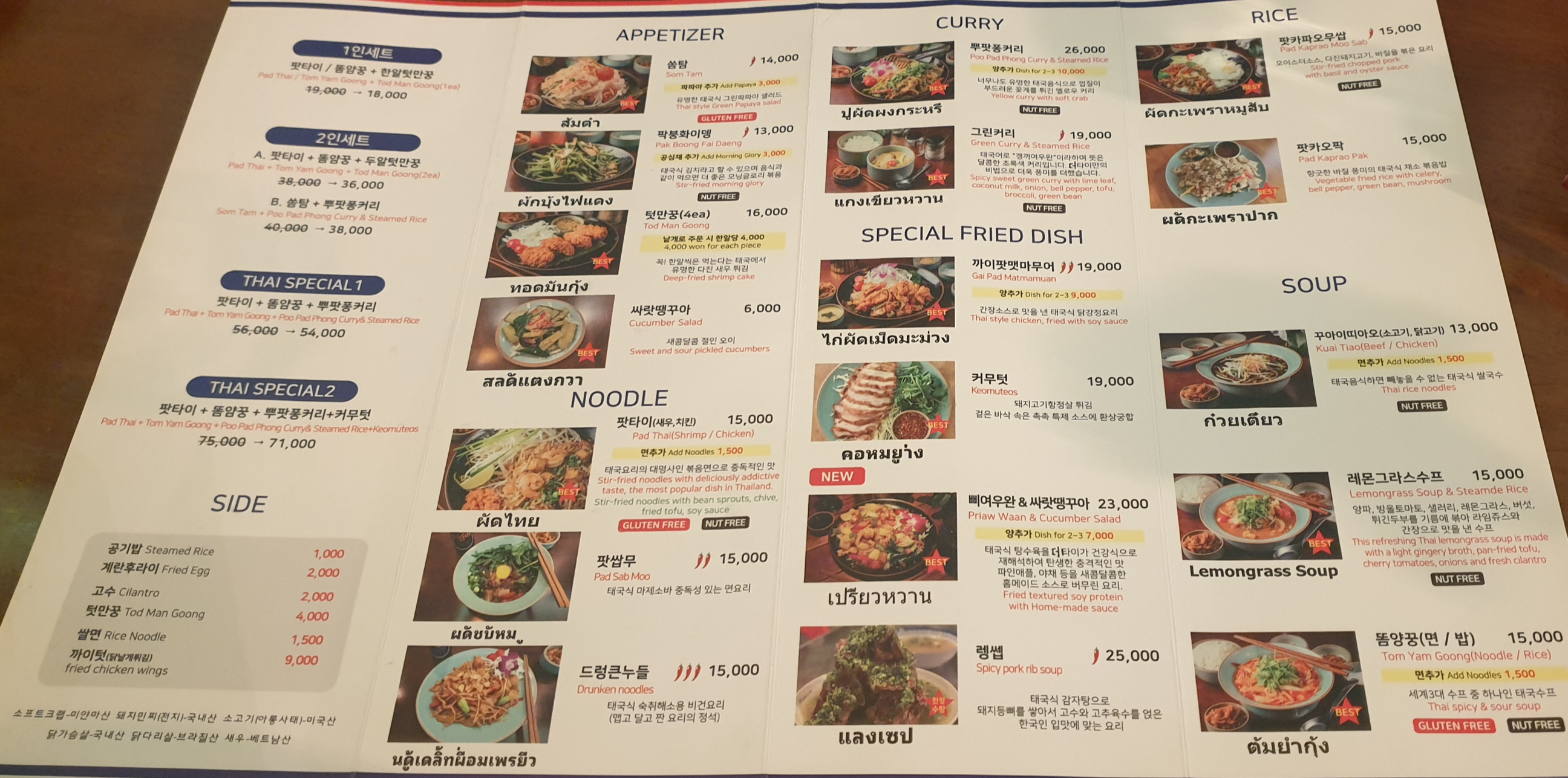 저희는 팟타이+똠양꿍+뿌팟퐁커리+커무텃으로 구성된 71,000원 가격인 세트메뉴와 싸랏땡꾸아라고 하는 오이를 6,000원을 주문했습니다.