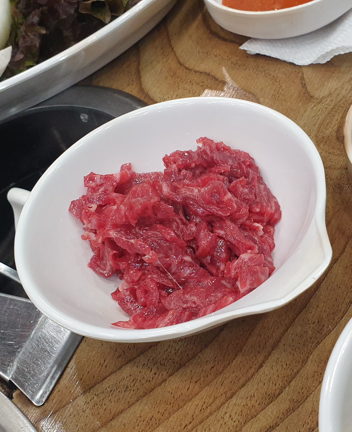 암소한마리는 육사시미와 치마살, 토시살, 제비추리, 차돌박이가 함께 나오는 메뉴인데 이것저것 섞여 있어서 처음에는 암소한마리를 먹고 입맛에 맞는 고기를 추가로 시키는 게 좋은 것 같습니다. 개인적으론 육사시미가 소금만 들어간 것 같은데 적당히 짭짤하면서도 식감이나 고기자체가 맛있었습니다. 치마살 같은 것도 생으로 먹어도 된다고 하길래 기름만 찍어서 먹어봤는데 맛있더군요.