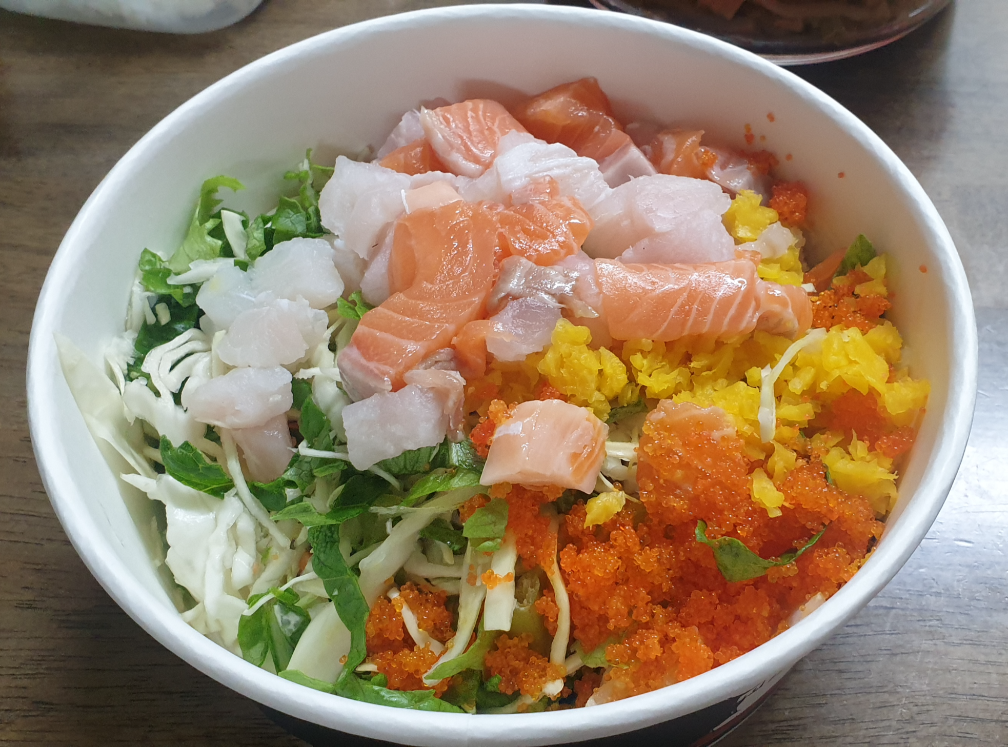 맛은... 개인적으론 별로였습니다. 회가 적은 것도 아쉬웠지만... 연어는 괜찮았던 것 같은데 참메기살이라고 하는 저 흰살생선이 뭔가 비린맛과 함께 좋게 말하면 숙성이 된 걸까요? 엄청 식감이 뭉그러진다 해야 하나... 그렇다고 녹는다 이런 건 아니고 입에서 계속 씹히면서도 식감이 물컹거리는 게 별로였습니다. 차라리 초밥이나 덩어리 연어를 사서 따로 썰어서 덮밥으로 해 먹는 게 더 나을 것 같다는 느낌이었습니다.