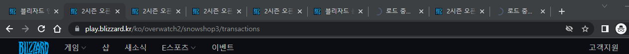 오버워치 2 돌격눈송이 교환소 마지막 날... 어제 100 퍼를 한다는 것을 잊고 오늘이 남은 눈송이를 쓸 마지막 기회라서 7시 땡 하자마자 눈송이 페이지를 여러 개를 켜서 켜지는 화면마다 경품을 클릭해서 또 화면 나오는 몇몇 화면에서 다시 버튼을 누르고.... 이걸 반복...