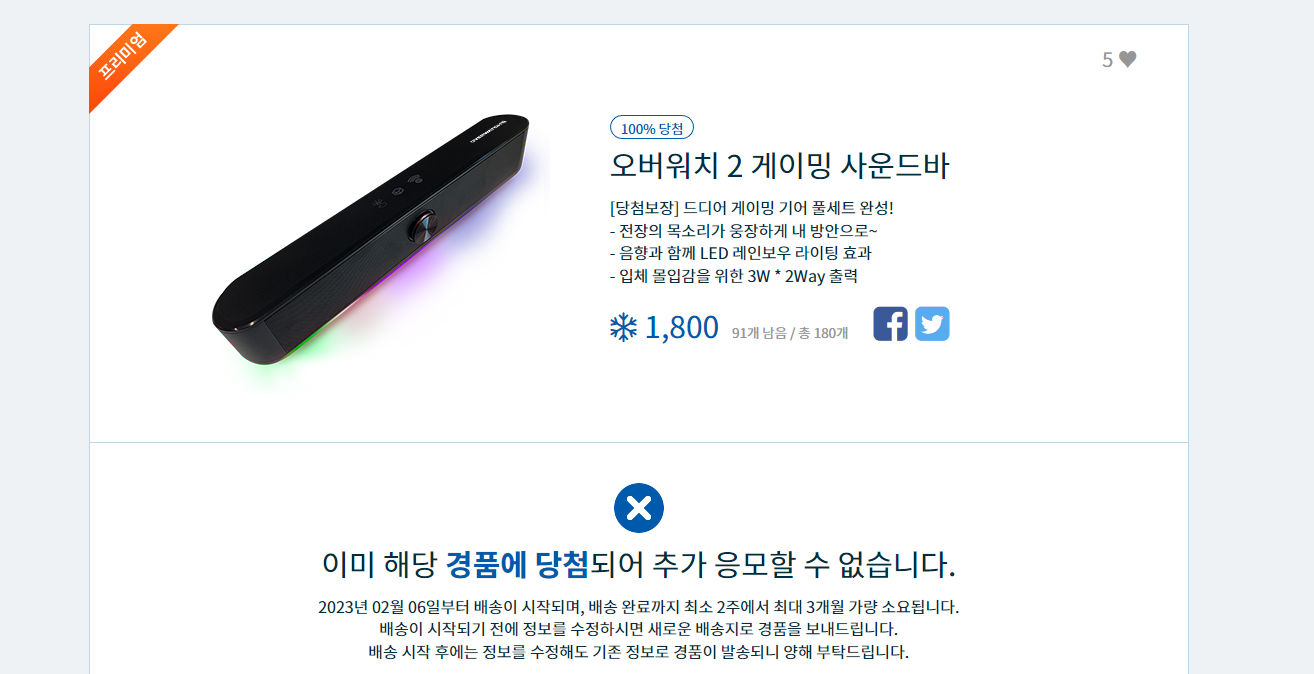 그러다가 확인된 사운드바... 이미 경품에 당첨됐다는 문구를 보고 성공했다는 걸 알았네요.
