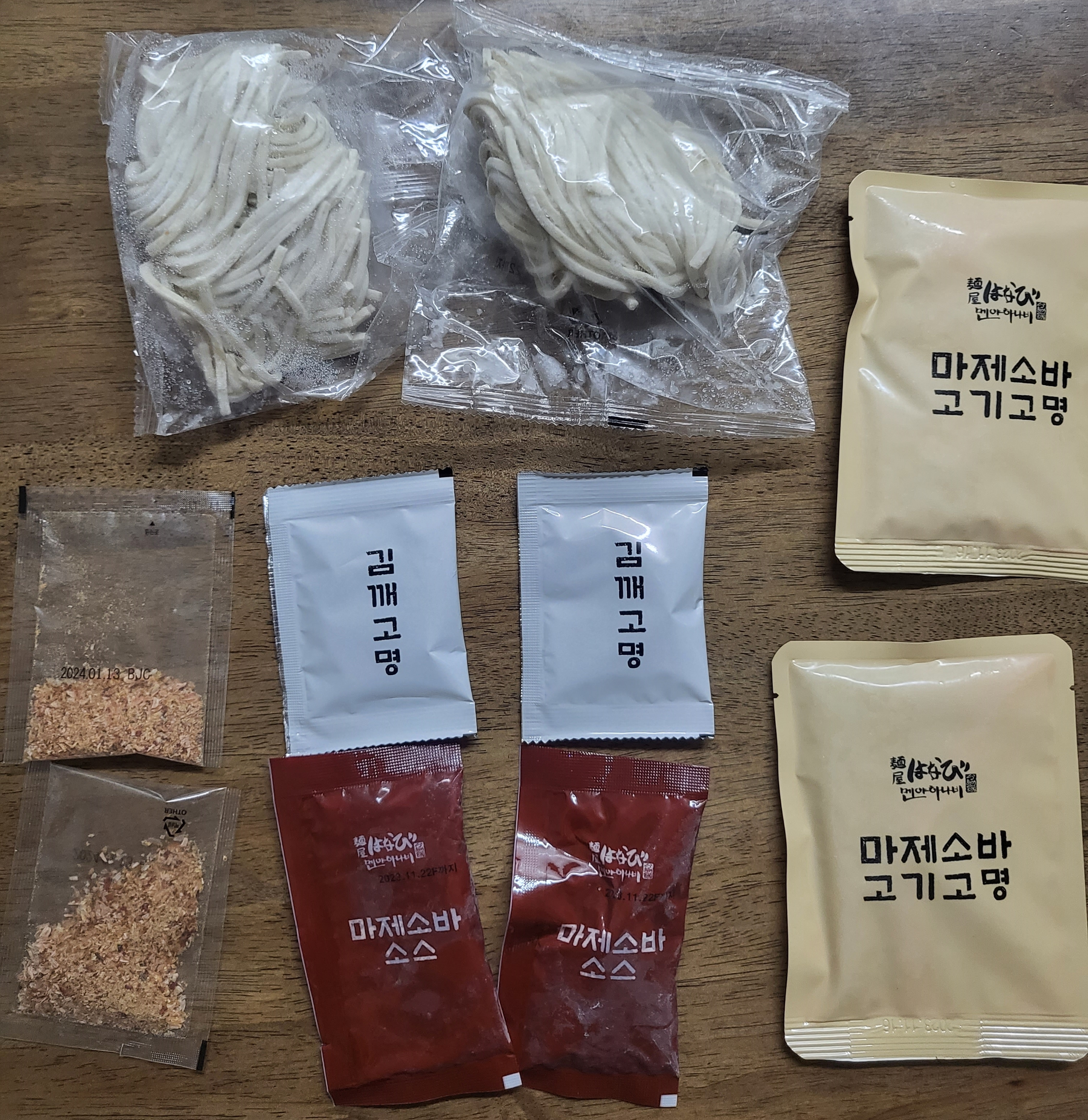 한팩에 2인분이 들어있고, 구성은 면과 고기고명, 소스, 가다랑어포, 김깨고명이 2개씩 들어있습니다.