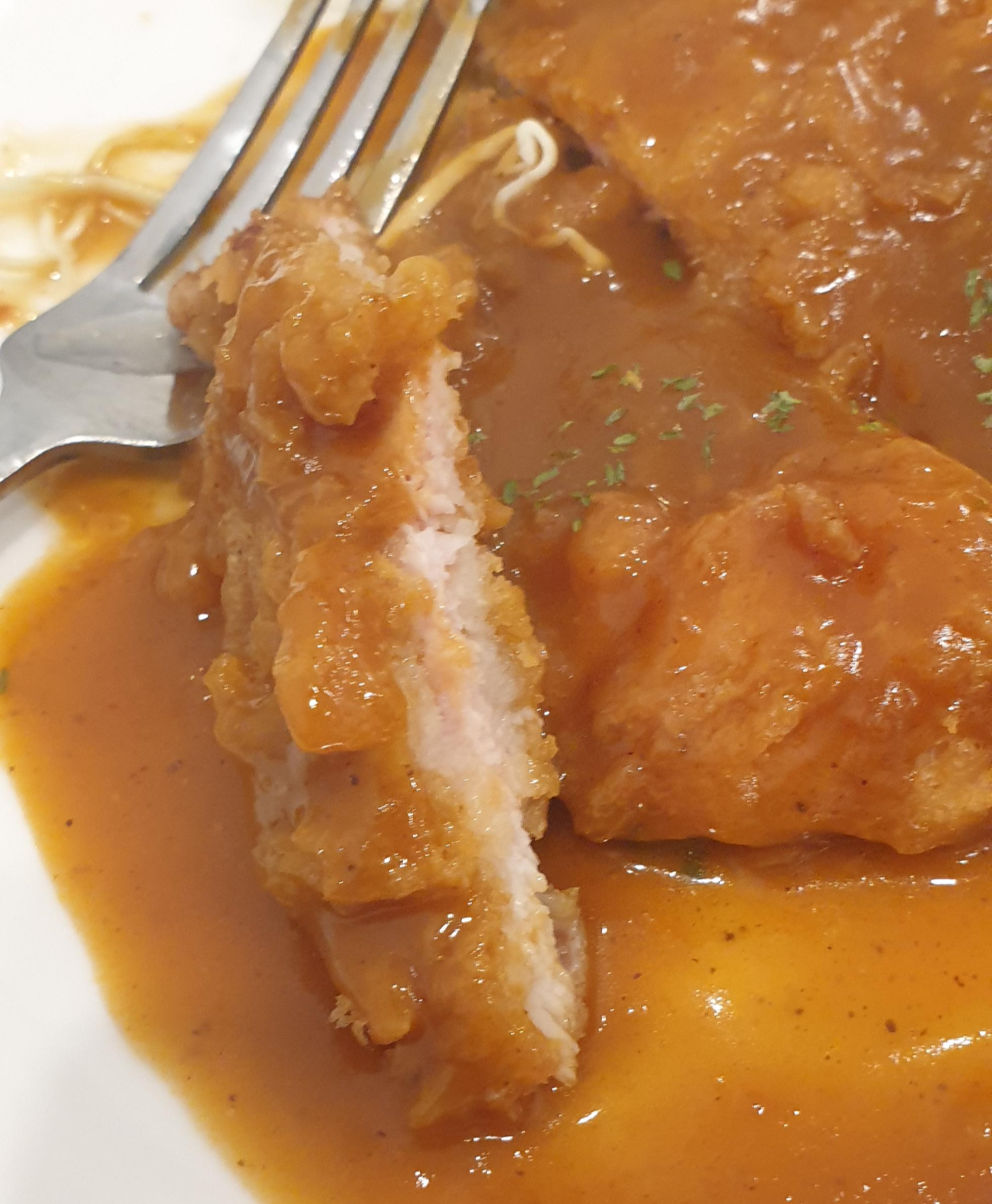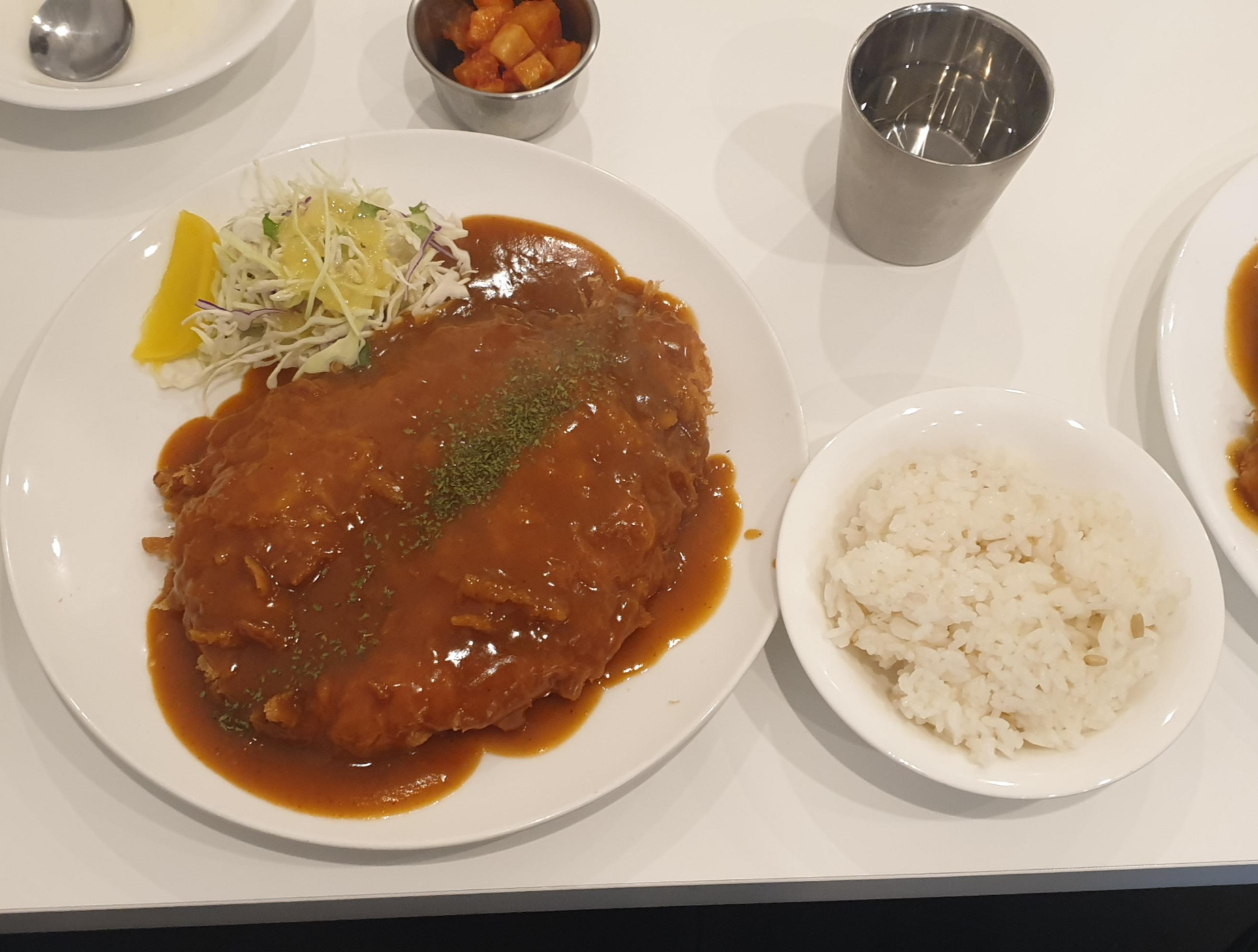 막상 먹어보니 은은하게 맵더군요. 막 엄청 맵다 이런 건 아닌데 먹다 보면 아 매운맛이네라고 생각할 정도로 딱 저한테 맞는 정도의 맵기였습니다. 돈가스 자체도 나이프 없이 숟가락으로도 잘릴 정도라 먹기도 편했고 고기는 두껍거나 그러진 않은데 소스가 있어서 밥하고 잘 어울려서 맛있게 먹었습니다.