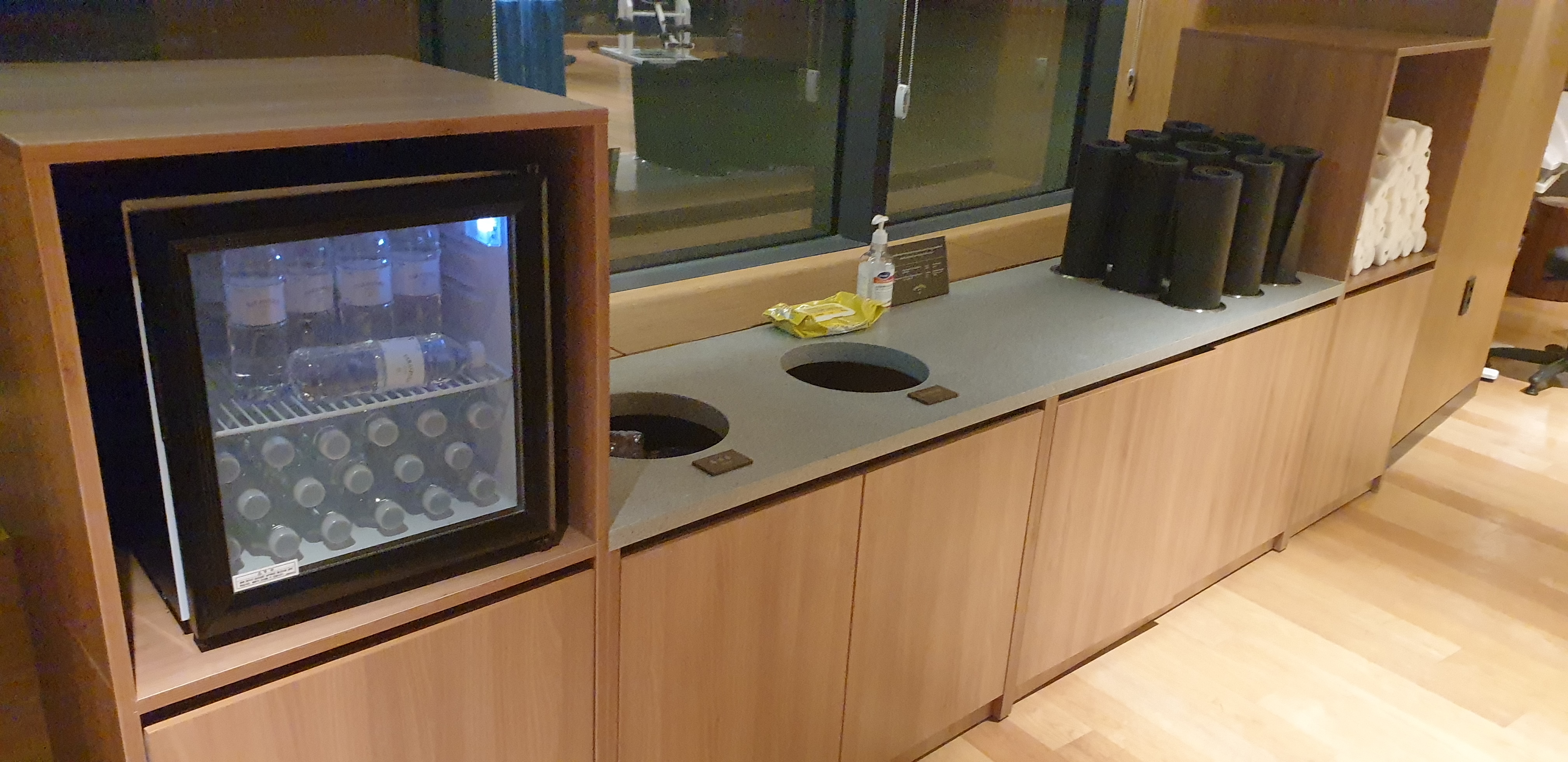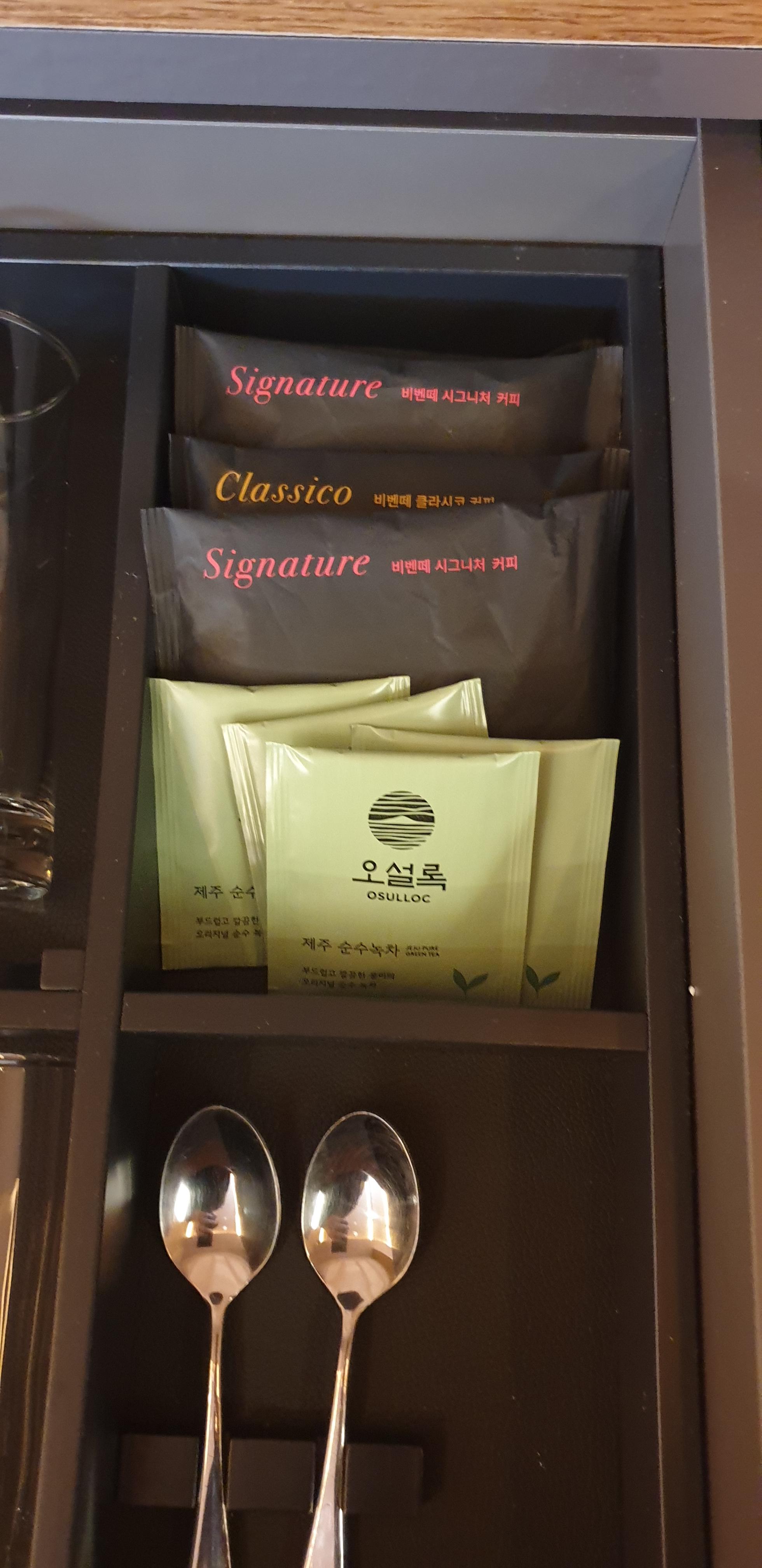 기다란 테이블 쪽에 커피포트와 냉장고가 있는데 냉장고에는 생수가 4개 들어있었습니다. 서랍에는 와인잔, 컵등등과 오설록 녹차와 티백 커피가 있었습니다. 커피 포트와 차와 커피가 있길래 커피를 먹어봤는데 고소하고 맛있었습니다.