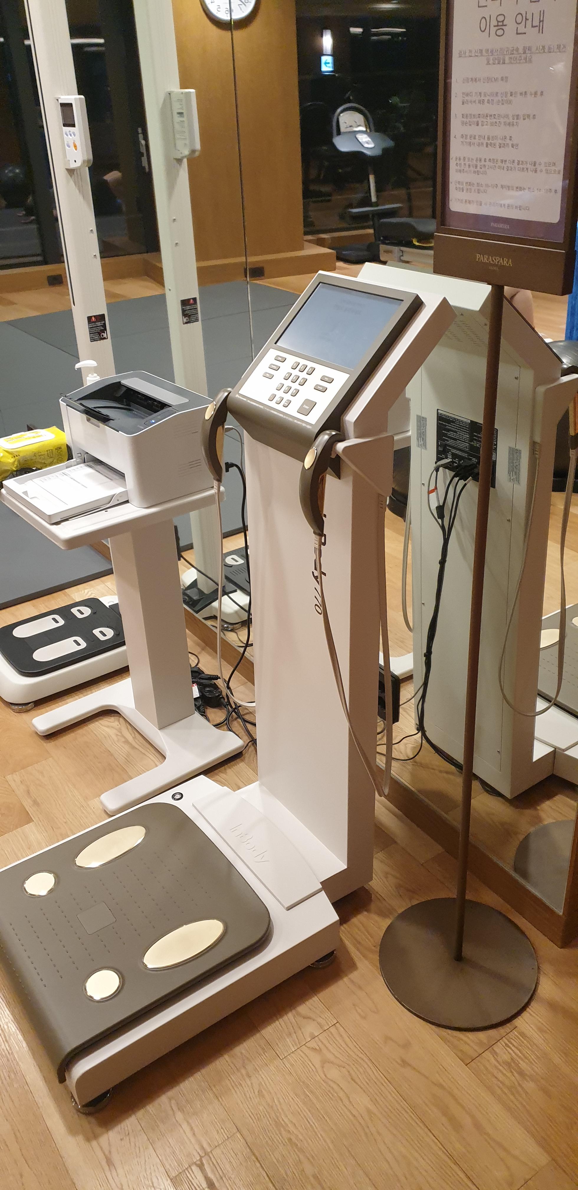 저녁을 먹고 저는 사우나를 별로 안 좋아해서 혼자 피트니스를 왔습니다. 1층에서 키를 받고 올라가면 되는데 옷을 1층에서 주는데 따로 필요하냐는 말을 안 하더군요. 3층에 올라가서 들어가 보니 다들 헬스복을 따로 입고 있길래 지나가던 직원 분께 물어보니 1층에서 받아와야 한다고 하더군요. 올라왔다가 바로 내려가니 따로 락커는 없기 때문에 숙소에서 갈아입던가 아니면 화장실에서 갈아입으라고 하면서 주시더군요... 왜 키를 주시면서 옷은 이야기 안 해주신 건지... 어쨌든 화장실에서 갈아입고 들어가니 창틀이나 의자에 다른 분들도 소지품들을 올려놓고 운동을 하시더군요. 저도 한쪽 구석에 패딩을 올려놓고 운동을 했습니다. 시설은 넓지는 않고 다양한 머신은 없지만 일단 머신에 사람이 없어서 좋았습니다. 한쪽엔 인바디가 있는데 셀프로 사용할 수 있고, 입구에 생수와 매트, 수건이 있습니다.
