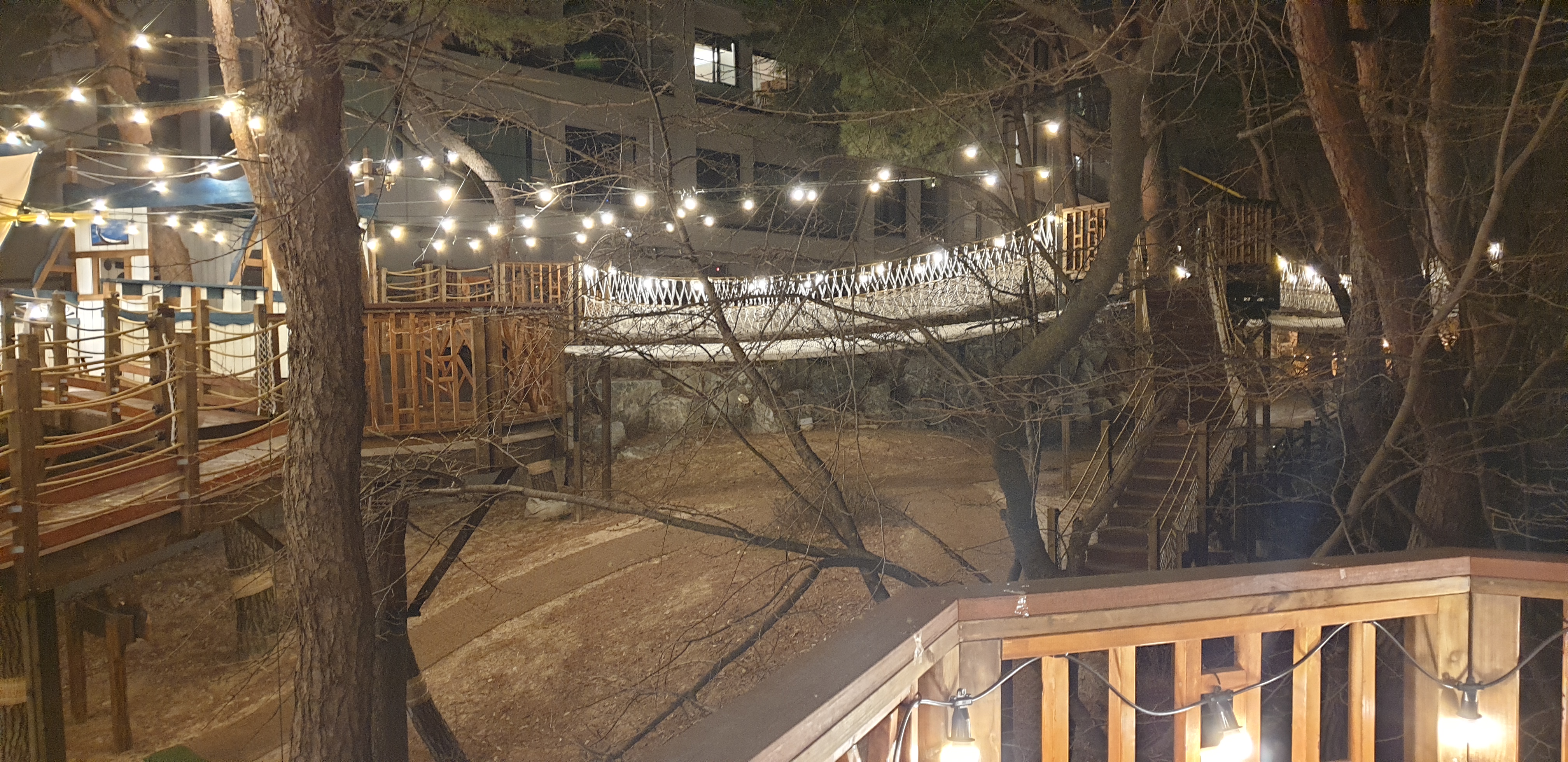 밥을 먹고 밤에는 호텔을 산책했습니다. 한쪽엔 트리하우스가 있는데 밤에 빛이 나서 이뻤습니다.