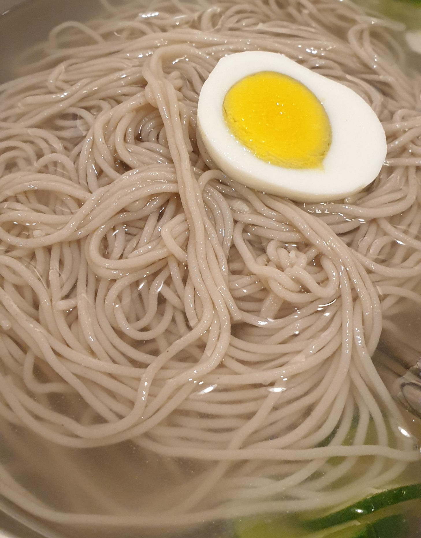 평양냉면은 사실 이번이 처음이라 기대? 를 하고 먹었습니다. 주변에서 엄청 물맛이라느니 아무 맛도 안 난다느니 혹은 감칠맛이 나중에 생각난다느니, 한 번으론 맛을 모른다느니 상반된 주장을 많이 들었던 음식이라 비빔으로 주문할까 하다가 오리지널 먹어보자는 생각으로 물냉면으로 주문했네요. 냉면이라곤 고깃집에서 먹던 게 다인 저에겐 메밀 함량이 많은 평양냉면은 냉면보다는 막국수 같은 느낌이었습니다. 원체 면을 좋아해서 그런지 면자체가 맛있어서 좋았습니다. 토핑으론 고기 2조각과 삶은 계란 반 개가 들어가고 육수 안에는 오이와 무가 보입니다.