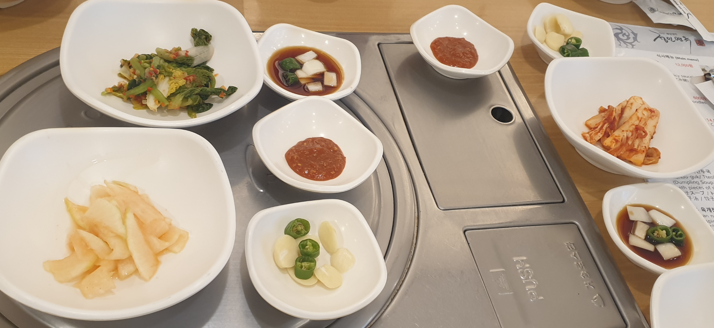 밑반찬으론 김치와 고추, 마늘, 절인무와 열무? 같은 게 나옵니다. 간장은 만두를 주문해서 나온 것 같네요.