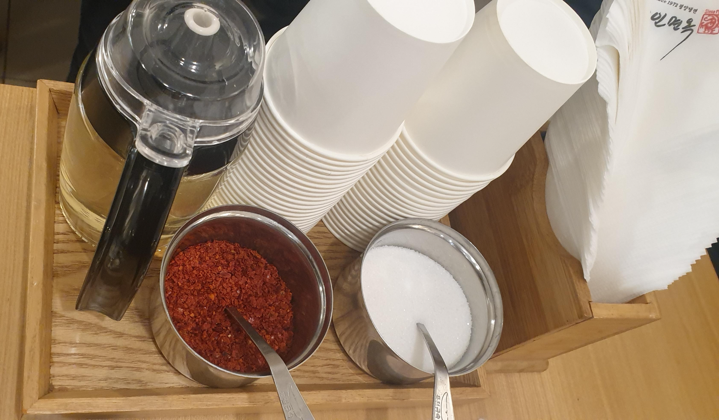 테이블에는 고춧가루와 식초 그리고 설탕이 비치되어 있습니다.