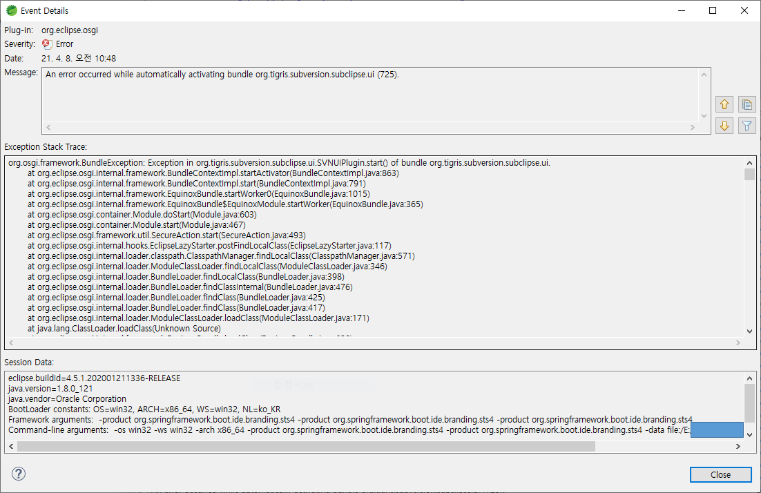 An error occurred while automatically activating bundle org.tigris.subversion.subclipse.ui