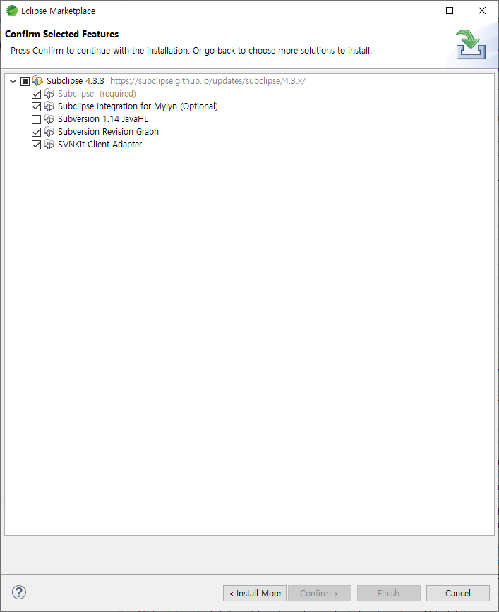 검색하다보니 버전을 낮추거나 플러그인을 인스톨할 때 JavaHL을 제외하고 하라는 내용을 확인하고, 플러그인의 JavaHL 부분을 제외하고 재설치 하니 정상적으로 작동하였다.