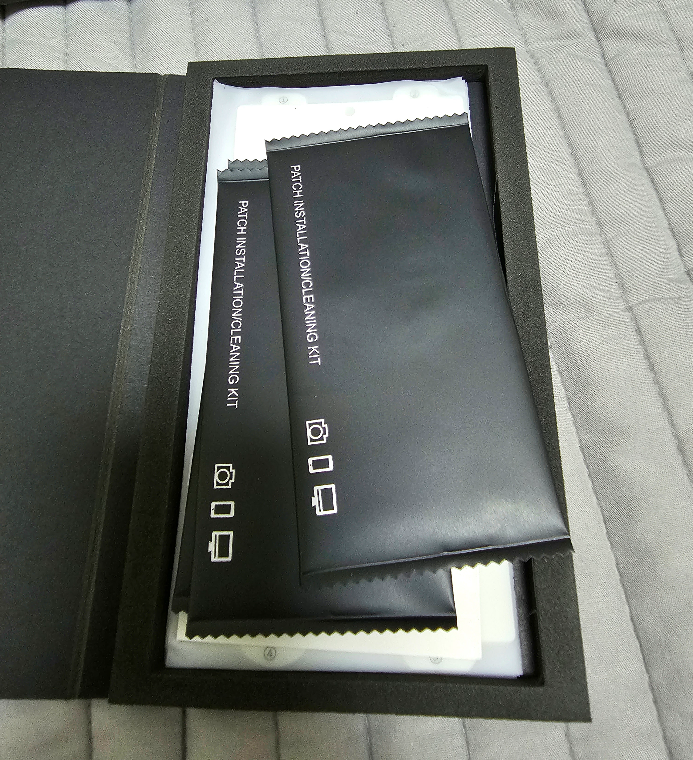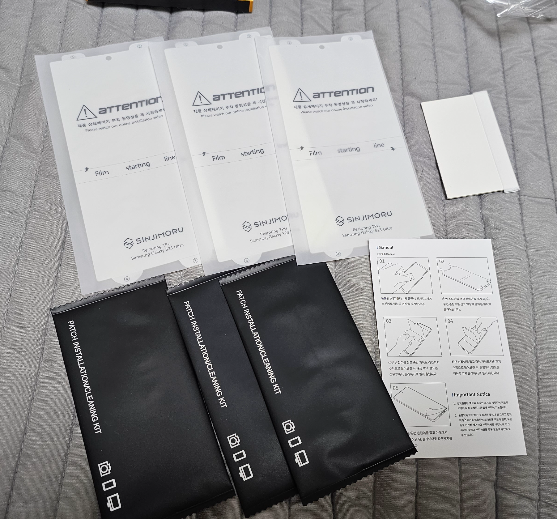 필름이 3개가 있고 필름을 붙일때 사용할 슬라이더 1개와 설명서 그리고 액정을 닦을 클리너 키드가 3개 들어있었습니다,.