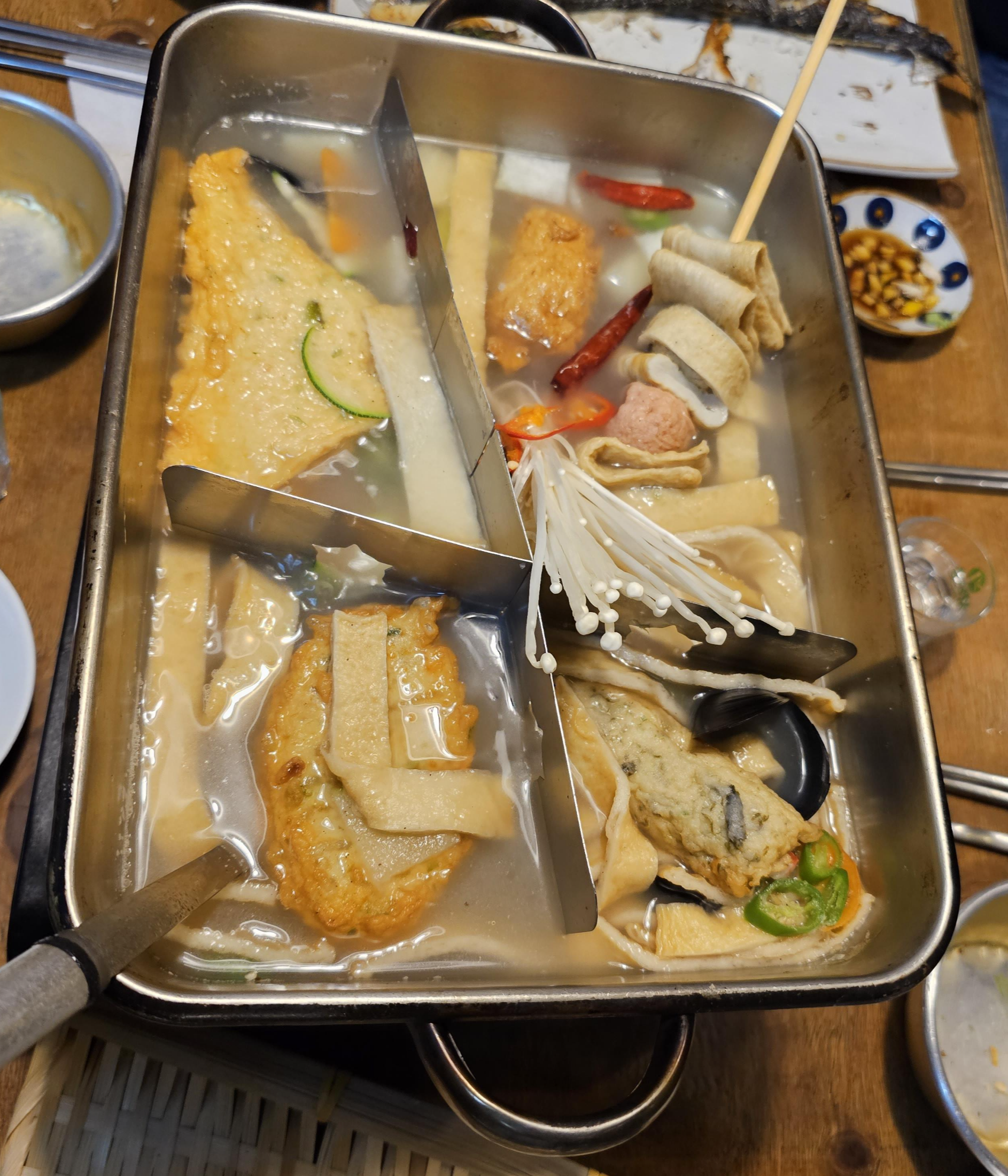 오뎅탕 나오자마자 칸막이는 들어서 빼고 먹었는데, 굳이 국물이 다른 것도 아니고 어묵이 뭐 색다르게 들어간 것도 아닌데 굳이 냄비에 칸막이가 있는 건 의아했습니다.