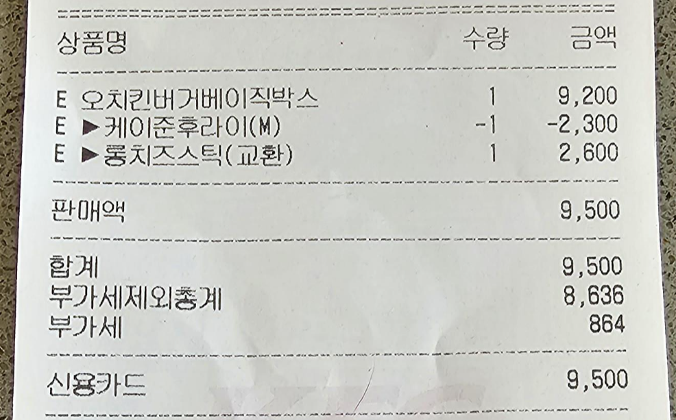 오치킨버거베이직박스를 주문했습니다. 저는 감자튀김을 별로 안 좋아해서 롱치즈스틱으로 교환을 했습니다.