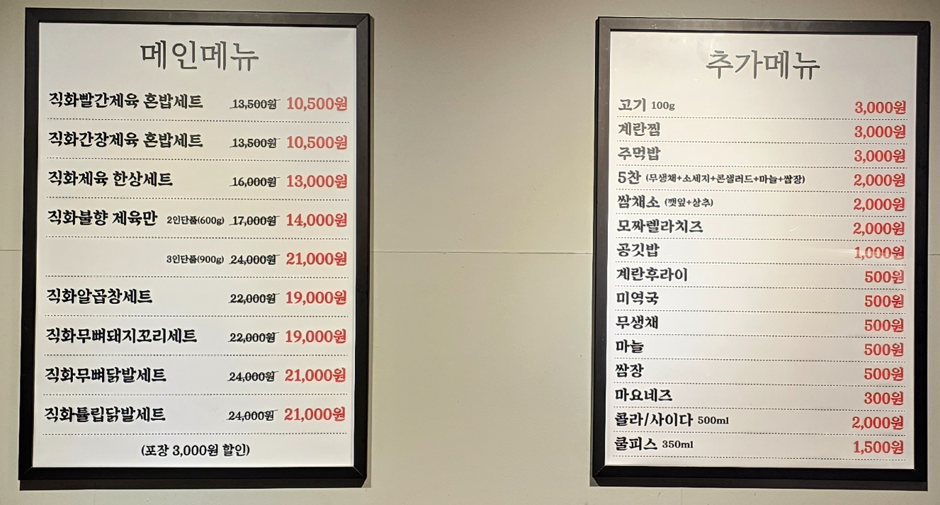 간판이 제일제육과, 제일직화포차가 둘 다 적혀있는데, 배달의 민족 같은 어플에는 제일제육으로 나오더군요.