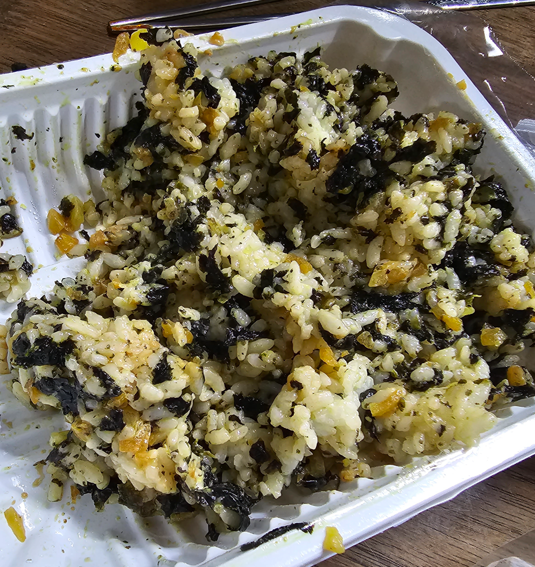 주먹밥을 만들기 귀찮아서 그냥 비벼서 먹었는데, 밥이 약간 질어서 떡 같은 느낌인 점이 개인적으로 진밥을 별로 안 좋아하는 저에겐 아쉬운 부분이었습니다. 맛자체는 마요네즈와 단무지 식감만으로 맛이 없을 수가 없는 조합인 것 같네요.