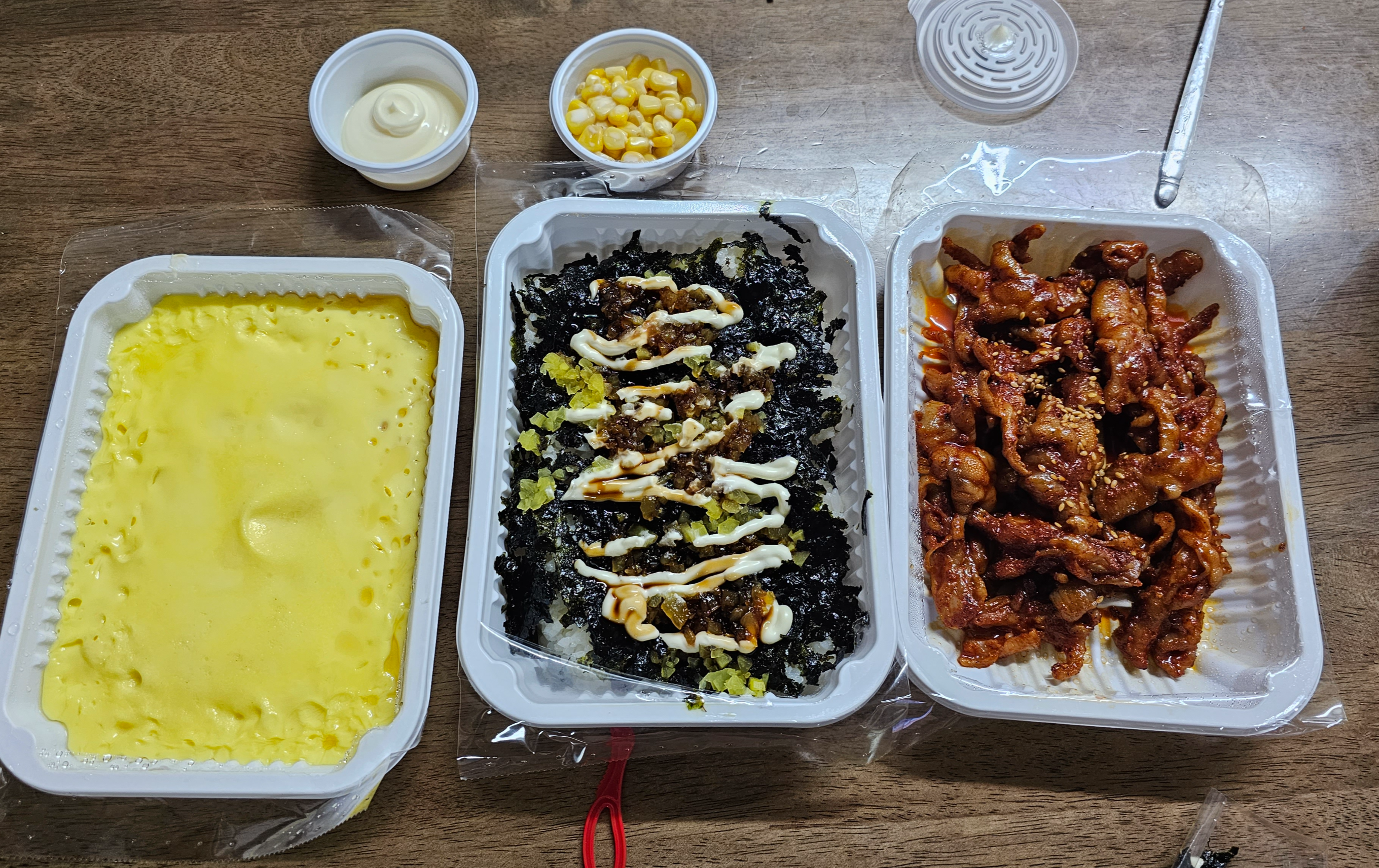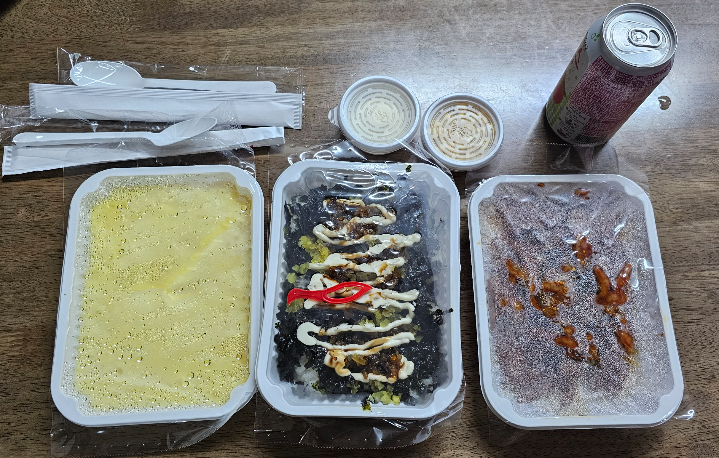 구성은 쿨피스 캔 1개와 계란찜, 주먹밥, 무뼈닭발 그리고 마요네즈와 콘샐러드가 들어있었습니다.
