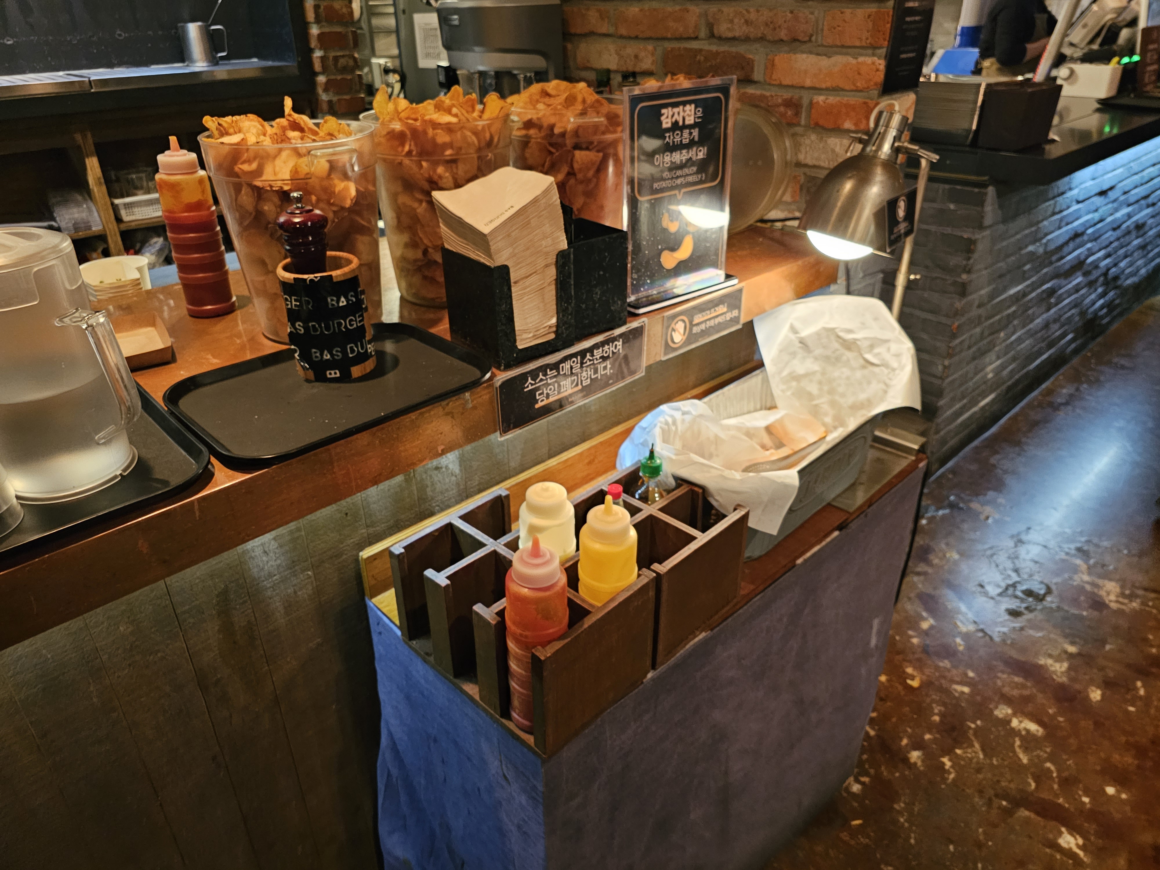은박 트레이에 버거와 감자튀김이 담겨서 나옵니다. 감자튀김은 그냥 평범한 맛이였는데, 셀프 코너에 마요네즈나 케첩 등등 다양한 소스가 있어서 감자튀김이 별로 안 좋아하는 저도 맛있게 먹을 수 있었습니다.