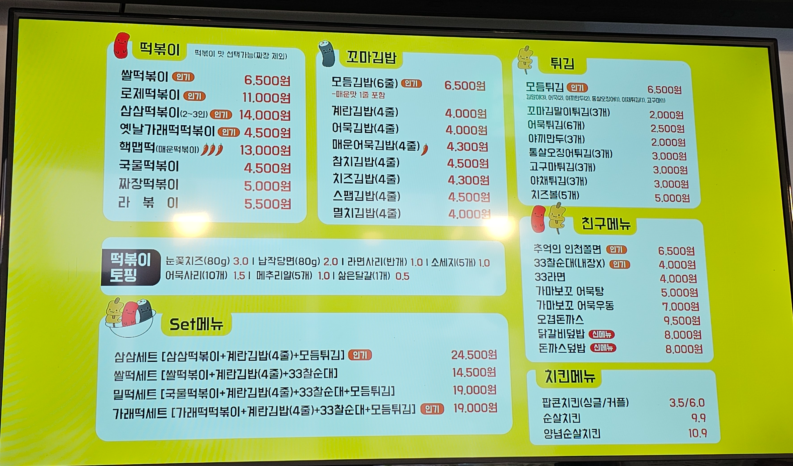 국물떡볶이, 계란김밥, 찰순대 구성인데 메뉴판에는 따로 없고 키오스크에는 있네요.